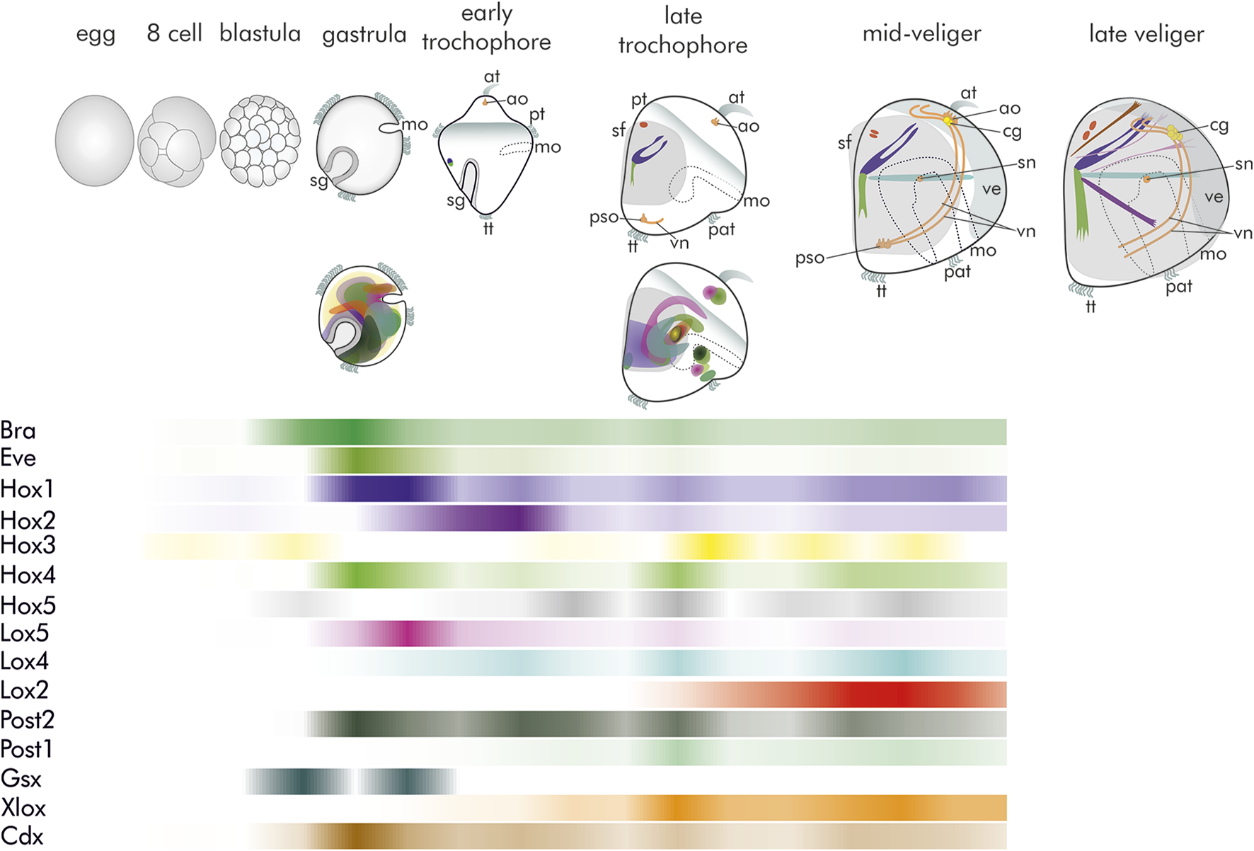 Schematic summary of morphogenesis, gene expression domains, and relative quantitative occurrence of transcripts of brachyury, even-skipped, as well as the genes of the Hox and ParaHox cluster in Dreissena. Data from Salamanca-Díaz et al. (2021) and Schulreich et al. (2022). Top row: Morphogenesis with developing nervous system and musculature. All images are in lateral view with apical facing upwards. (at) apical tuft, (ao) apical organ, (cg) anlagen of the future cerebral ganglion, (mo) mouth opening, (pat) pre-anal tuft, (pso) posterior larval sensory organ, (pt) prototroch, (sf) shell field, (sg) shell gland, (sn) stomatogastric nerve cell, (tt) telotroch, (ve) velum, (vn) ventral neurites. Grey surfaces mark the developing shell and prototroch/velum, respectively. The first serotonin-like immunoreactive (lir) flask-shaped apical cell (orange) appears in the trochophore stage. Myogenesis (green/blue) starts in close proximity to the shell gland. In the late trochophore, two serotonin-lir flask-shaped cells are present in the apical organ, together with the first-formed serotonin-lir flask-shaped cell of the posterior larval sensory organ and the anlage of the ventral neurites. In addition, the dorsal velum retractor (blue), larval retractor (green), and anterior adductor anlage (red) emerge. Four flask-shaped cells form the apical organ in the D-shaped mid-veliger stage, while two roundish, non-sensory cells (yellow) form the anlage of the future cerebral ganglia. In the posterior larval sensory organ, a third flask-shaped cell emerges. A stomatogastric nerve cell is present. The larval retractor (green), the two-partite anterior adductor (red), the dorsal velum retractor (blue), and the ventral velum retractor (turquoise) are present. The immunoreactive cells of the posterior larval sensory organ have disappeared, and the anlage of the future cerebral ganglion has enlarged. Additional muscles of the late veliger larva include two mantle retractors (pink), a foot retractor (purple), and an accessory velum retractor (brown). Middle: Schematic representation of gene expression domains of brachyury (bra), even-skipped (eve), Hox, and ParaHox genes. Most genes are expressed in the gastrula and late trochophore stage. Note the overlapping, non-staggered (non-collinear) mode of expression of Hox genes. For color code see bars in relative expression timeline chart below. Bottom: Schematic representation of relative quantitative abundance of brachyury (bra), even-skipped (eve), Hox, and ParaHox gene transcripts.