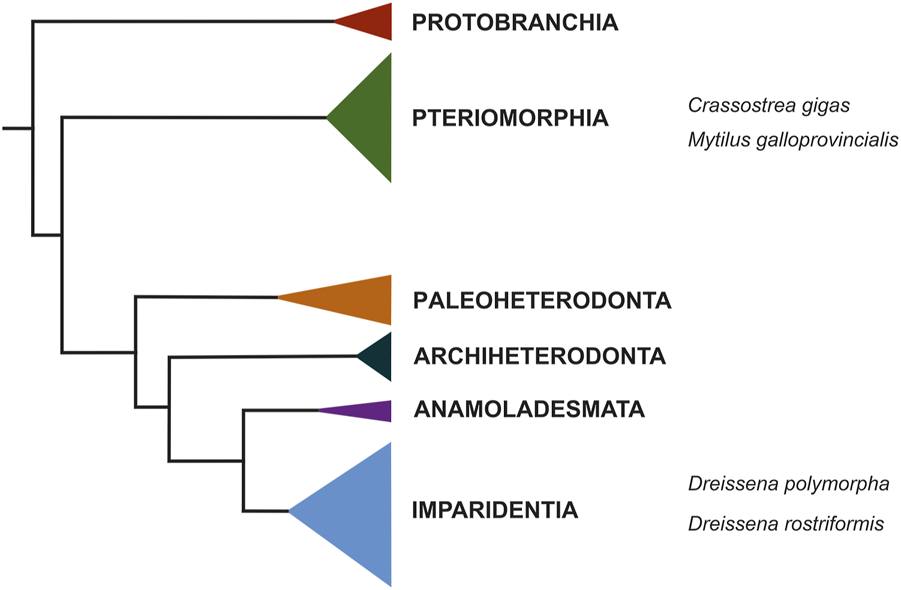 Condensed phylogeny of Bivalvia based on a supermatrix composed of 47 molluscan taxa. Modified after Calcino et al. (2019). The quagga mussel, Dreissena rostriformis, together with its congener Dreissena polypmorpha, the zebra mussel, is nested within Imparidentia. The only two other bivalve species for which comparable genomic and transcriptomic resources are available, the Pacific oyster, Crassostrea gigas, and the Mediterranean mussel, Mytilus galloprovincialis, are marine species and are phylogenetically distant to the quagga mussel, residing within Pteriomorphia.