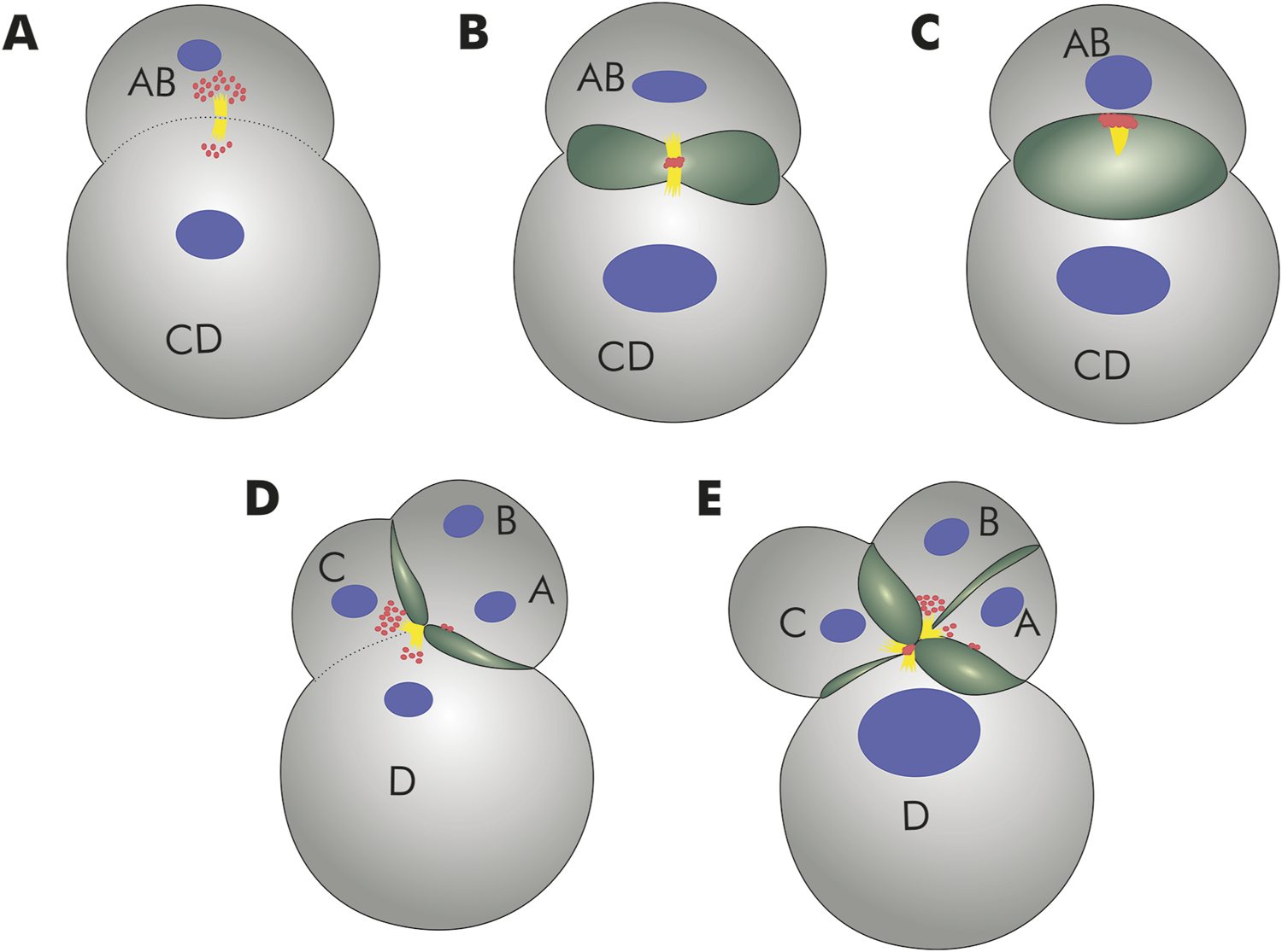 Schematic representation of lumen formation during Dreissena rostriformis cleavage as proposed by Zieger et al. (2022). (A) Aquaporin (red) accumulation at the cytokinetic bridge (yellow). Cell nuclei in blue. (B) Aquaporin is recruited to the midbody during cleavage. Cleavage cavity (green) formation is initiated. (C) Expansion of the cleavage cavity and separation of the blastomeres AB and CD. One of the two daughter cells inherits the aquaporin immunoreactive midbody remnant. (D) The larger CD blastomere divides slightly earlier than the smaller AB blastomere, giving rise to a transient three-cell stage. Note the aquaporin accumulation prior to formation of the second midbody between blastomeres C and D. Two additional cytokinetic bridges are produced by the second round of cleavages; these bridges are displaced towards the interface between the A/D and B/C blastomeres in the middle of the embryo. (E) Subsequent cleavages result in additional cavities along the cleavage furrows of forming blastomeres with aquaporin remaining accumulated along the cavity membranes.
