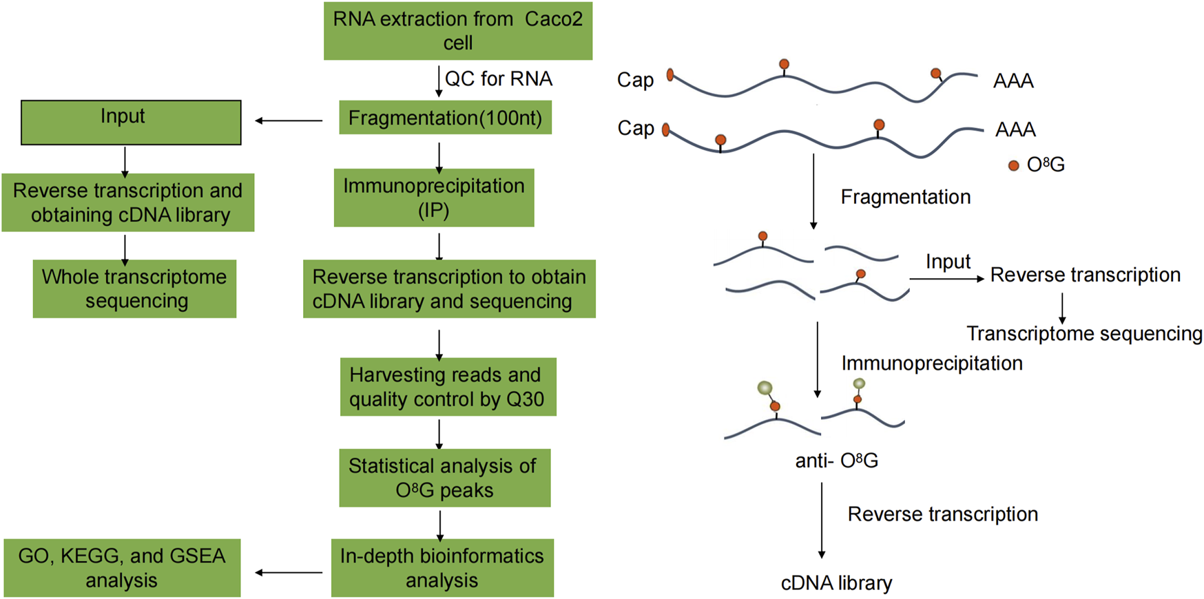 Methylated RNA immunoprecipitation sequencing (MeRIP-seq) is a commonly used technique for detecting o8G modifications. This method breaks down purified total RNA or mRNA into 100–150 nt RNA fragments; Subsequently, RNA fragments were co-incubated with o8G-modified antibodies, and the o8G-modified RNA fragments were enriched with antibodies for library construction and sequencing. Finally, the o8G-modified transcriptome region was obtained by comparison with the control library co-incubated with the o8G-modified antibody.