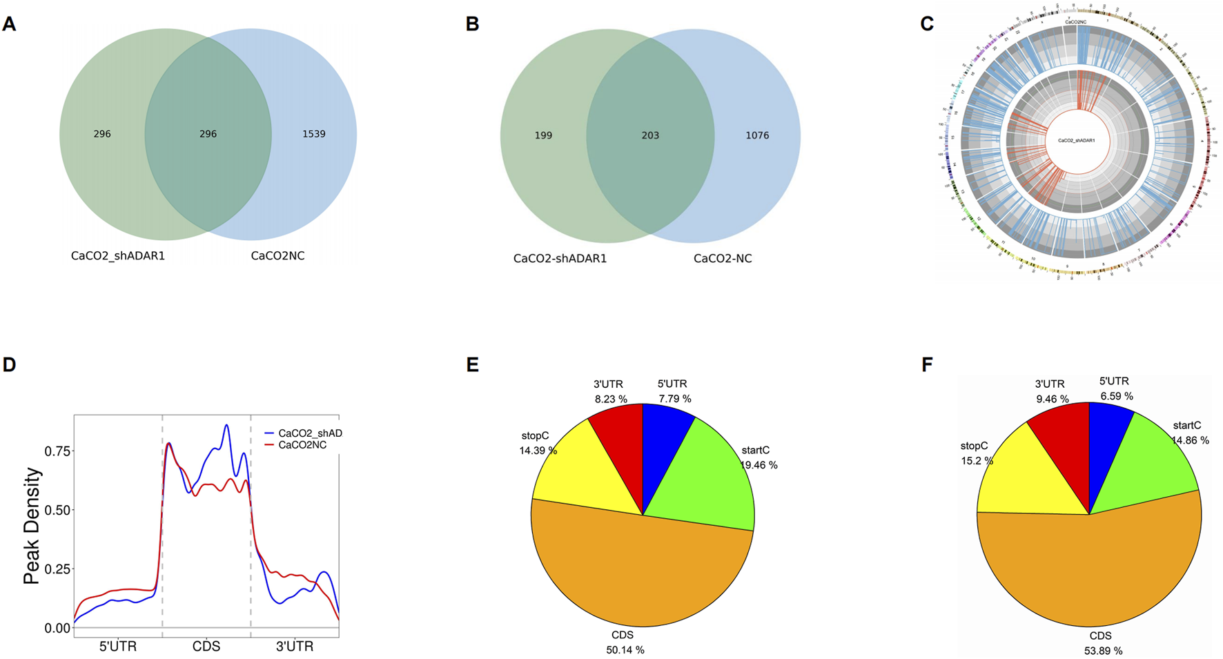 Characteristics of o8G peaks in CaCO2 cell and sh-ADAR1 CaCO2 cell. (A) Venn diagram of o8G peaks in CaCO2 cell and sh-ADAR1 CaCO2 cell. (B) Venn diagram of o8G genes in CaCO2 cell and sh-ADAR1 CaCO2 cell. (C) Visualization of o8G at the chromosome level in CaCO2 cell and sh-ADAR1 CaCO2 cell. (D) Accumulation of the region of average o8G peaks along all transcripts in CaCO2 cell and sh-ADAR1 CaCO2 cell. (E,F) Pie chart of the source of methylated mRNA in CaCO2 cell and sh-ADAR1 CaCO2 cell.