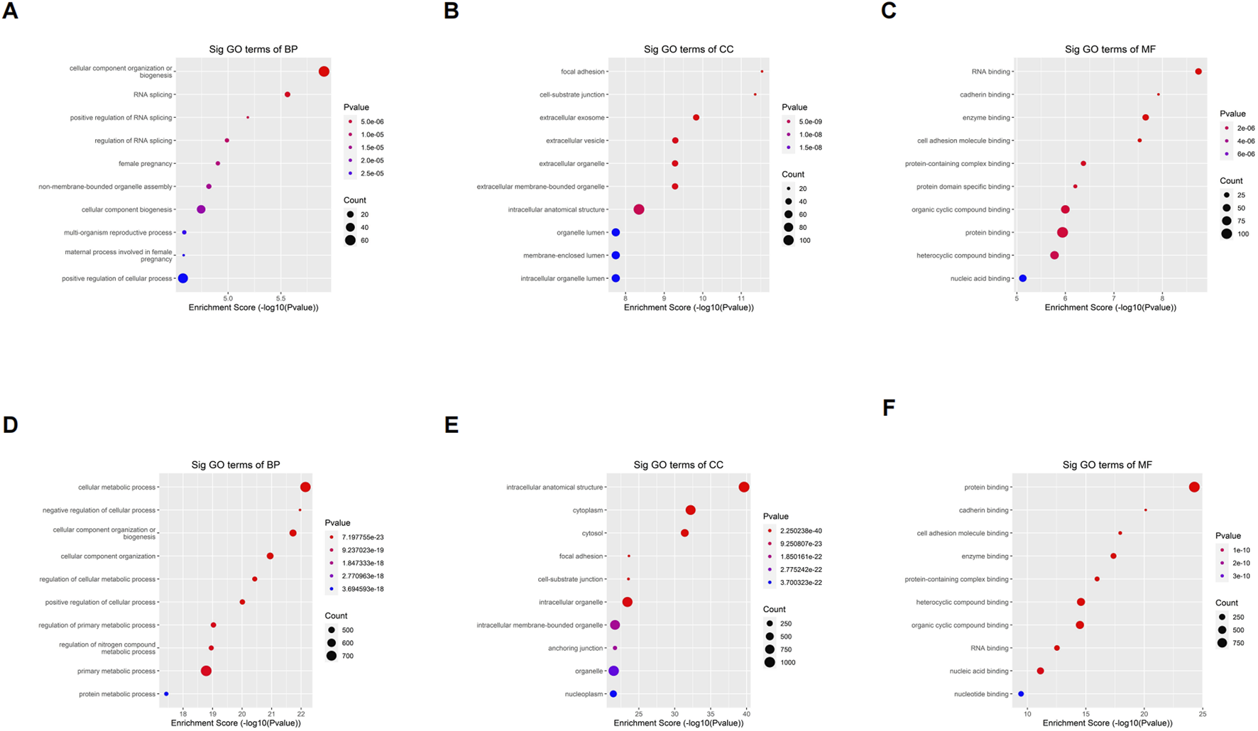 Gene ontology analyses of CaCO2 and shADAR1-CaCO2 cell. (A) Biological processes, (B) cellular components, and (C) molecular functions of genes annotated by upregulated o8G peaks in sh-ADAR1 CaCO2 cell group. (D) Biological processes, (E) cellular components, and (F) molecular functions of genes annotated by downregulated o8G peaks in sh-ADAR1 CaCO2 cell group. The top ten most significant terms are shown for each analysis.