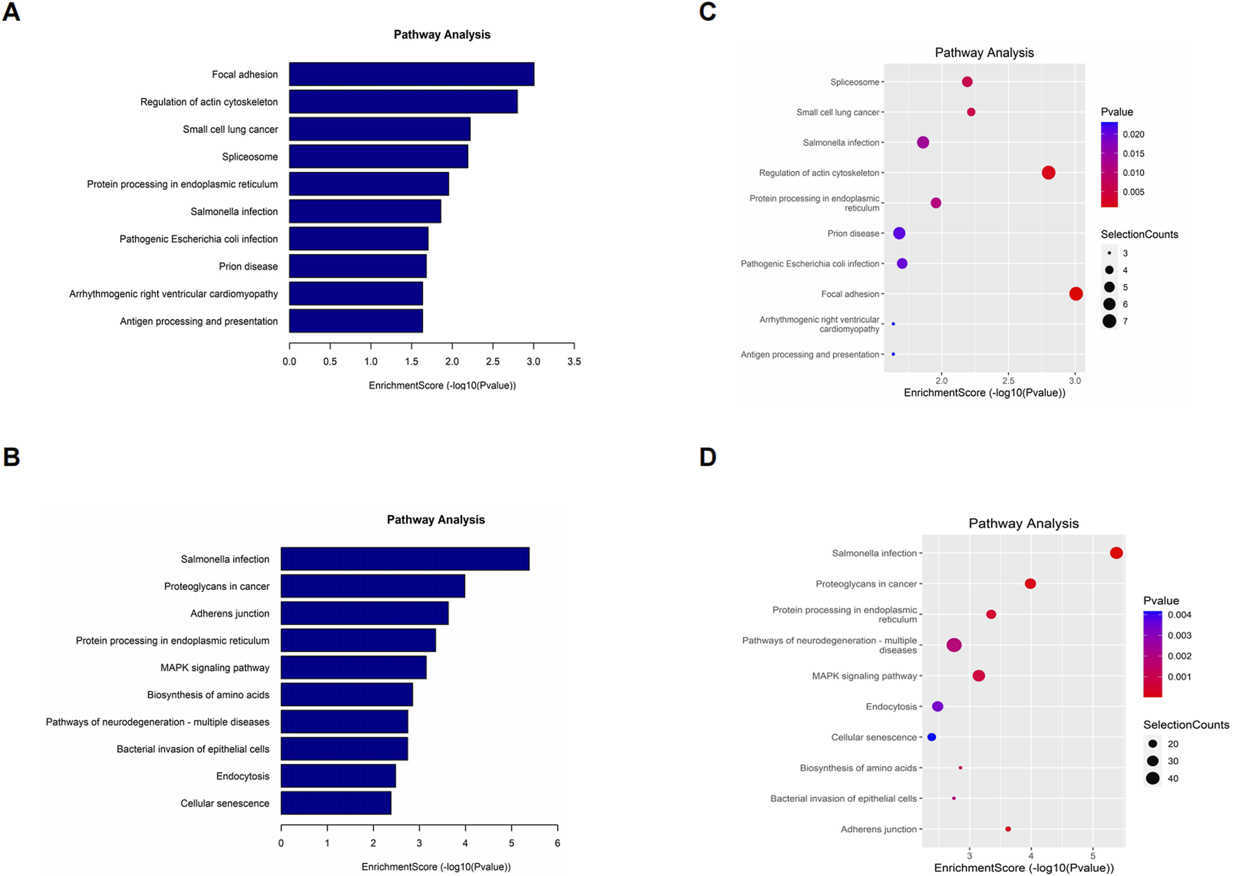 Kyoto Encyclopedia of Genes and Genomes analysis of differentially methylated genes in CaCO2 and shADAR1-CaCO2 cell. (A,B) Pathway analysis of up-methylated genes in sh-ADAR1 CaCO2 cell group. (C,D) Pathway analysis of down-methylated genes in sh-ADAR1 CaCO2 cell group. The top ten most significant terms are shown for each analysis.