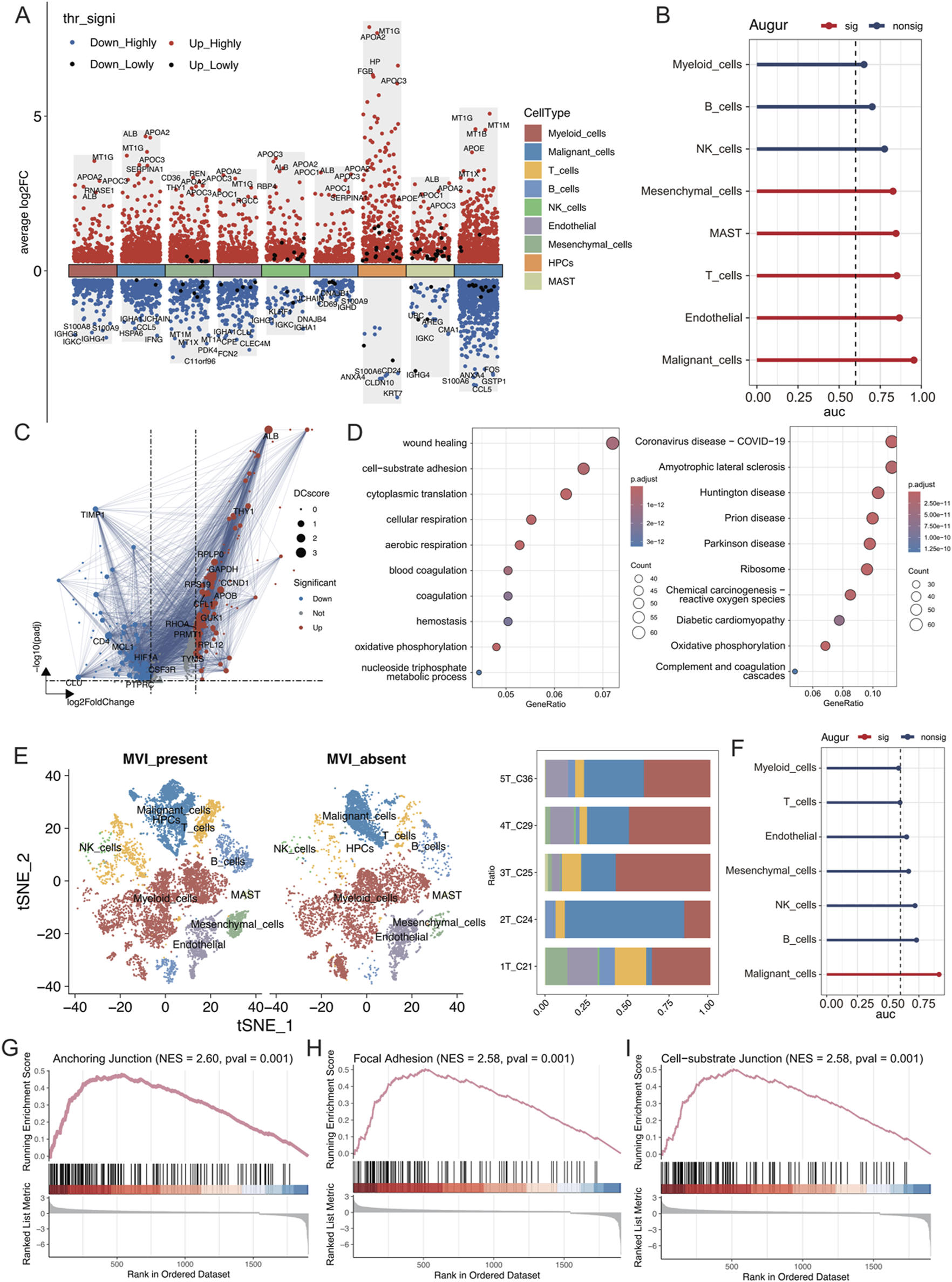 Figure 2. (A) Differential gene expression in each cell type was analysed using the Wilcoxon rank-sum test. “High” represents an adjusted p value less than 0.05, and “Low” indicates an adjusted p value less than 0.1. (B) AUC scores of transcriptomic perturbations were determined using the random forest framework, indicating more intense transcriptomic perturbations in cells from the NT and tumour groups. (C) Volcano plots showing differentially expressed genes in endothelial cells between the NT and tumour groups, with DC representing the strength of the PPI network interactions based on the STRING database. (D) GO and KEGG enrichment analyses of differentially expressed genes. (E) t-SNE visualization of each cell type in tumours with and without MVI; the right panel shows the proportion of cell types in each tumour sample. (F) AUC values of transcriptomic perturbations were assessed in a random forest framework, with higher AUC values indicating more significant transcriptomic perturbations occurring in cells from the tumours with and without MVI. (G–I) The GSEA calculations based on differentially expressed genes from the tumour groups with and without MVI are shown for relevant pathways.