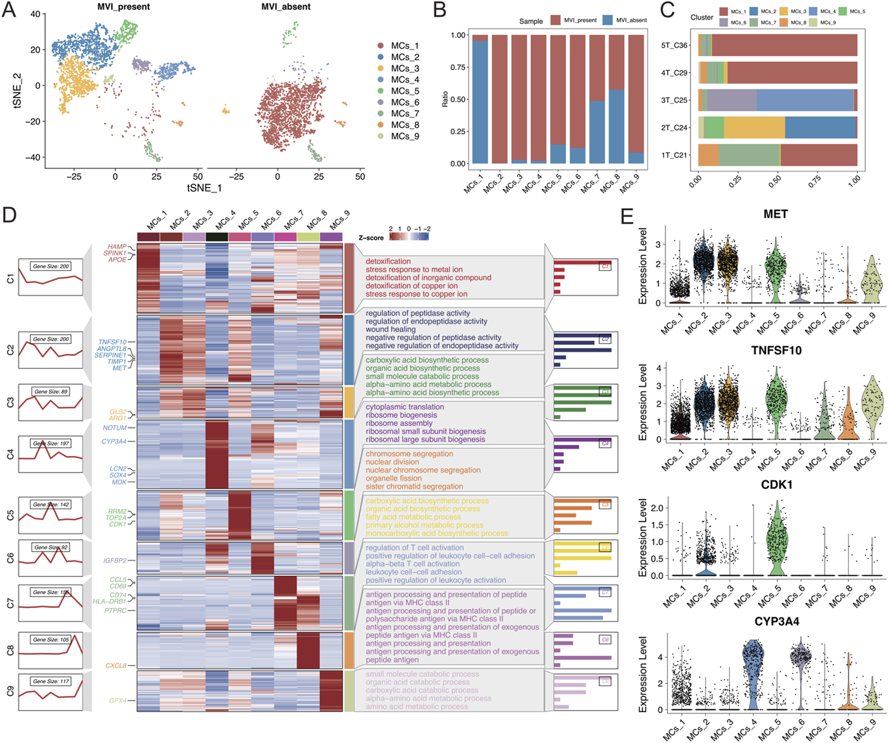 Figure 3. (A) t-SNE plot illustrating the results of malignant cell segmentation, with different colours representing various cell types. The left plot shows the group with MVI, and the right plot shows the group without MVI. (B) Stacked bar graph displaying the proportions of malignant cell subgroups in each group. (C) Stacked bar graph illustrating the proportion of malignant cell subgroups in each sample. (D) Left: A series of graphs illustrating the dynamic patterns of representative differentially expressed genes (DEGs) across each malignant cell population. Middle panel: Heatmap showing representative DEGs between each cell cluster. Right panel: Representative enriched Gene Ontology (GO) terms for each cluster. (E) Expression levels of MET, TNFSF10, CDK1, and CYP3A4 in each malignant cell subgroup.
