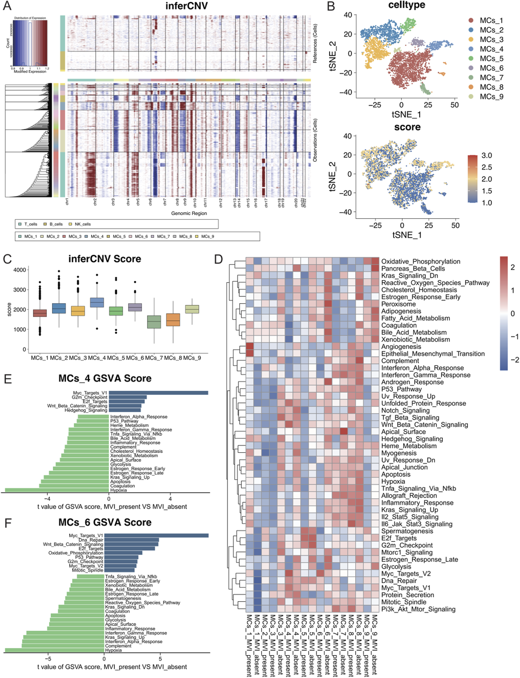 Figure 4. (A) Copy number variations in each malignant cell subtype according to the inferCNV analysis using T cells, B cells, and NK cells as references. (B) The CNV scores of each cell are mapped onto the malignant cell t-SNE map, with varying shades of colour representing the CNV scores. (C) Box line plots depicting CNV scores for nine different malignant cell subtypes. (D) GSEA heatmap of the 50 marker gene sets from the MSigDB database, with each subgroup of malignant cells presented according to their status in the groups with and without MVI. (E) Quantitative analysis of pathway differences in the MCs_4 subtype with and without MVI. (F) Quantitative analysis of pathway differences in the MCs_6 subtype with and without MVI.