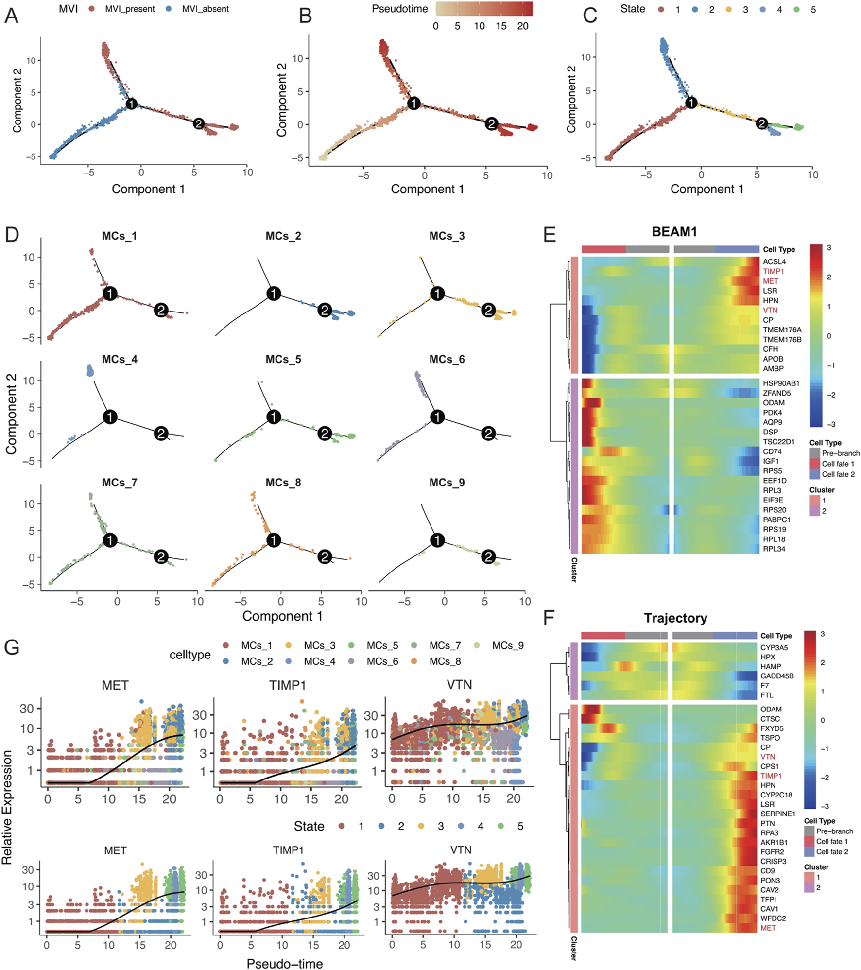Figure 5. (A–D) Monocle analysis for inferring the trajectory of malignant cell subsets, coloured by (A) MVI status, (B) time of inference fitting, (C) assumed status during Monocle fitting, and (D) origin of the malignant cell subset. (E) Pseudotemporal heatmap displaying the BEAM analysis of the top 30 genes showing significant changes before and after node 1. (F) Pseudotemporal heatmap highlighting the top 30 genes that underwent significant changes along the trajectory. (G) Expression levels of MET, TIMP1, and VTN, coloured by malignant cell subgroup category and inferred developmental status as pseudotime progressed.