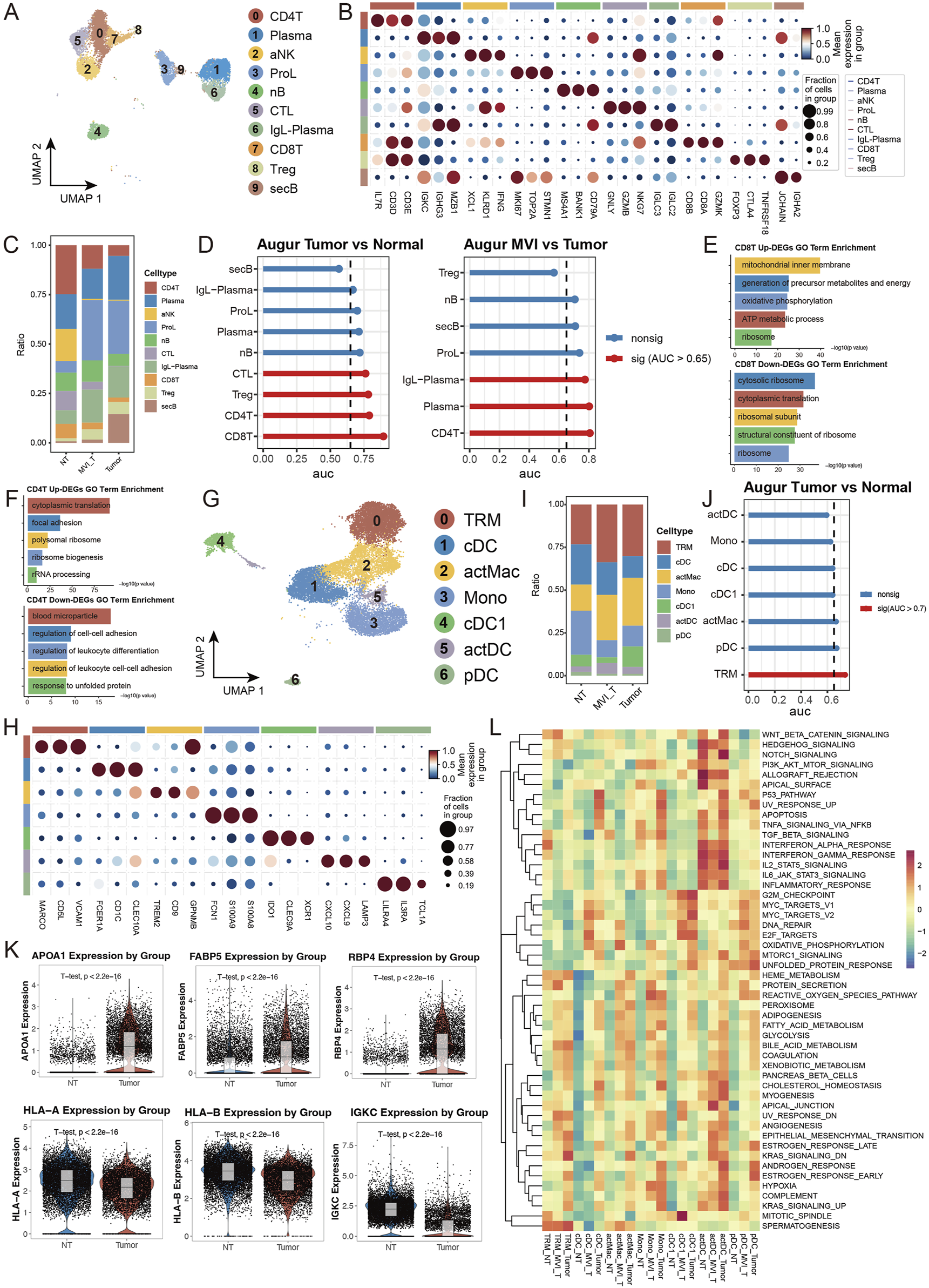 Figure 6. Single-cell Transcriptomic Analysis Reveals Heterogeneous Characteristics of Lymphoid and Myeloid Cells: (A) UMAP dimensionality reduction plot of lymphoid cell subpopulations, identifying ten major subtypes: CD4+ T cells (CD4T), Plasma cells, Activated NK cells (aNK), Proliferating lymphocytes (ProL), Naive B cells (nB), Cytotoxic lymphocytes (CTL), IgL + Plasma cells (IgL-PC), CD8+ T cells (CD8T), Regulatory T cells (Treg), and Secretory B cells (secB). (B) Expression profiles of characteristic marker genes for each lymphoid cell subpopulation, used for cell identity confirmation. (C) Stacked bar plot showing the proportion distribution of lymphoid cell subtypes in tumor and normal groups. (D) Transcriptional perturbation analysis using Augur. (E, F) Gene set enrichment analysis of differentially expressed genes in CD8T cells comparing Tumor vs. Normal, separately analyzed for (E) upregulated and (F) downregulated genes. (G) UMAP dimensionality reduction plot of myeloid cell subpopulations, identifying seven major subtypes: tissue-resident macrophages (TRM), Conventional Dendritic Cells (cDC), Activated Macrophages (actMac), Monocytes (Mono), Type 1 cDC (cDC1), Activated DC (actDC), and Plasmacytoid DC (pDC). (H) Expression profiles of characteristic marker genes for each myeloid cell subpopulation. (I) Stacked bar plot showing the proportion distribution of myeloid cell subtypes in tumor and normal groups. (J) Transcriptional perturbation analysis using Augur. (K) Violin plots showing representative gene expression. (L) Heatmap of GSEA enrichment analysis based on 50 characteristic gene sets from MSigDB, displaying functional features of myeloid cell subpopulations across different groups.