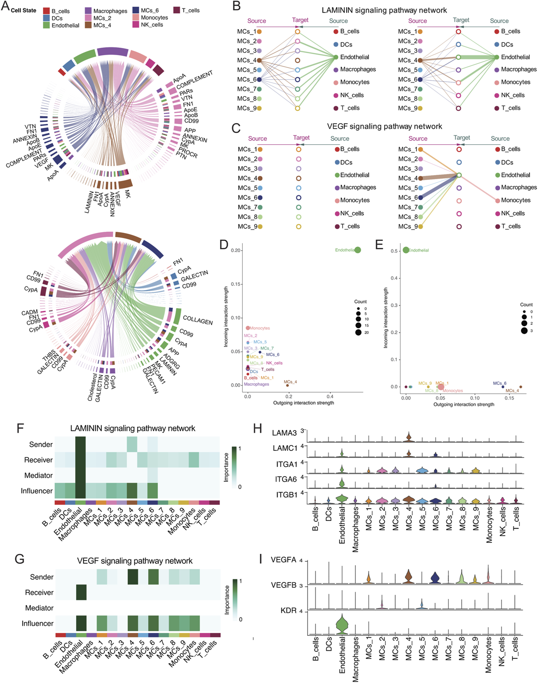 Figure 7. (A) Line graphs demonstrating receptor‒ligand interactions involving the MCs_2, MCs_4, and MCs_6 subtypes as both signal senders and receivers. (B, C) Hierarchical diagrams depicting inferred intercellular communication networks for (B) laminin signalling and (C) VEGF signalling. Interactions are categorized into sources and targets, marked with solid and hollow circles, respectively, with the width of the connecting lines indicating the probability of communication. (D, E) Dot plots showing the (D) senders and receivers of the laminin signalling pathway, as well as the (E) senders and receivers of the VEGF signalling pathway. The X- and Y-axes represent the total outgoing and incoming communication probabilities associated with each group, respectively. The size of the dots correlates positively with the number of inferred links (efferent and afferent) associated with each cell block, and the colours of the dots represent different cell groups. (F, G) Heatmaps showing network centrality scores for (F) laminin signalling and (G) VEGF signalling. (H, I) Violin plots illustrating the expression of molecules involved in (H) laminin signalling and (I) VEGF signalling across all cell types.