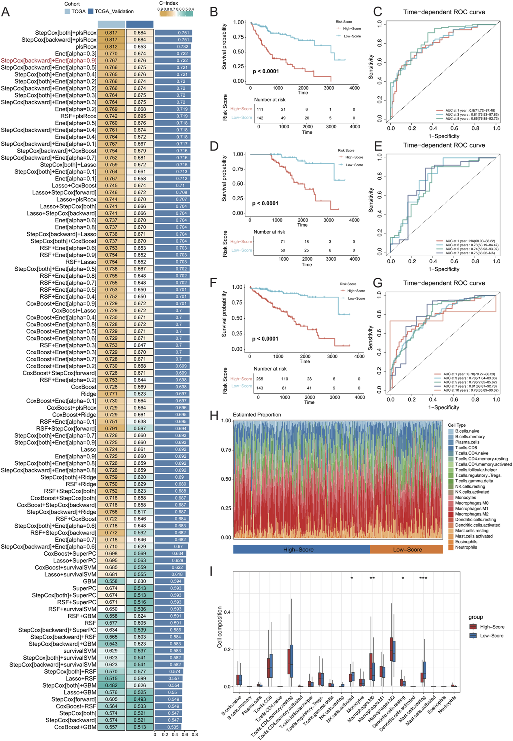 Figure 8. (A) Development and validation of the consensus characterization MRS model through an integrated machine learning-based procedure involving a total of 101 prognostic models using the LOOCV framework. The C-index of each model was calculated for all training and validation datasets. (B) Kaplan‒Meier (K–M) survival curves of the MRS prognostic models in the training set. (C) ROC curves for the training set, evaluating the performance of the models using 1-year, 3-year, and 5-year AUC values. (D, E) K‒M survival curves and ROC curves for the MRS prognostic models in the validation set. (F, G) K‒M survival curves and ROC curves for the MRS prognostic model across all samples. (H) Identification of immune infiltration in the high- and low-risk groups differentiated by the model using the CIBERSORT approach. The box plot shows the immune cell infiltration for each type of immune cell. (I) * represents p < 0.05, ** represents p < 0.01, and *** represents p < 0.001.