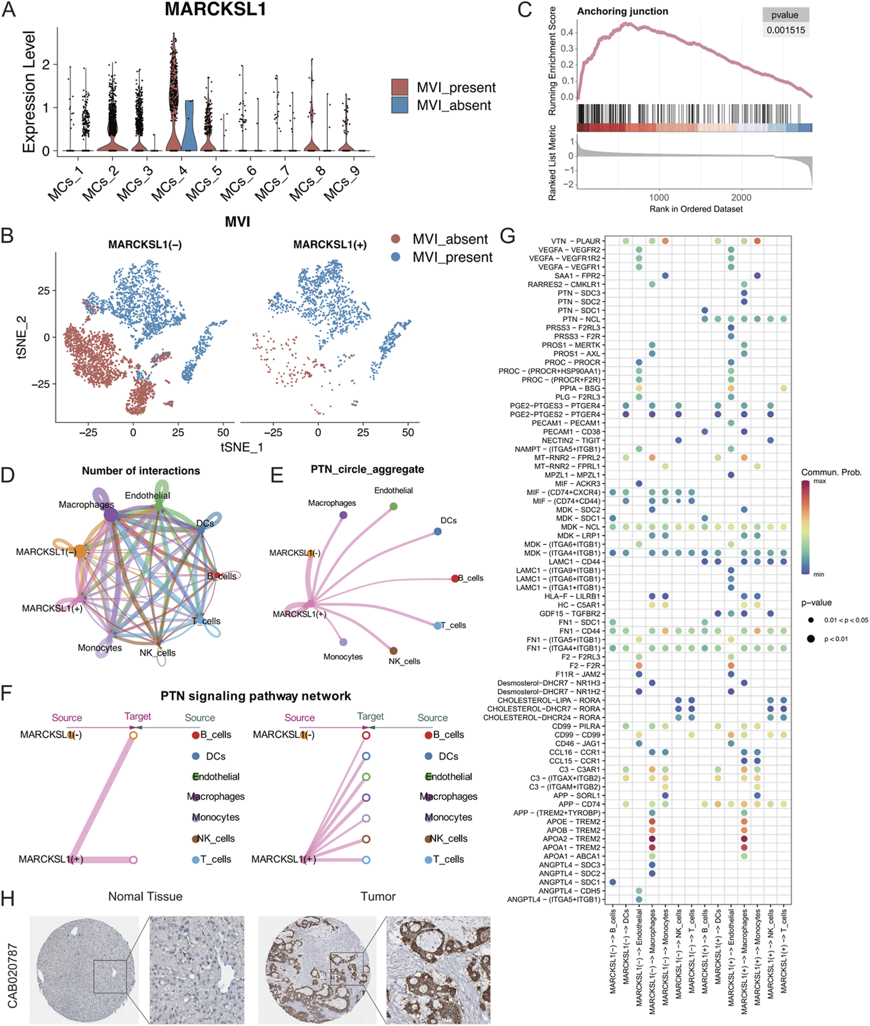 Figure 9. (A) MARCKSL1 expression across various malignant cell subgroups. (B) t-SNE plot displaying malignant cells coloured according to MARCKSL1 expression, where MARCKSL1 (+) represents cells expressing MARCKSL1 and MARCKSL1 (−) represents cells lacking MARCKSL1 expression. (C) GSEA plot indicating activation of the anchoring junction pathway in the MARCKSL1(+) group. (D) Circular plots illustrating the number of interactions between the indicated MARCKSL1 subgroups and immune cells. (E) Circular plots of the intensity of interactions of all cells involved in the PTN signalling pathway. (F) Hierarchical plot displaying the interaction intensity of PTN signalling pathway components with other cell types in MARCKSL1(+) cells. (G) Illustration of receptor‒ligand interactions generated by the MARCKSL1(+) and MARCKSL1(−) malignant cell signal senders. (H) Based on the Human Protein Atlas database, increased expression of MARCKSL1 was found in hepatocellular carcinoma tissue compared to normal tissue.