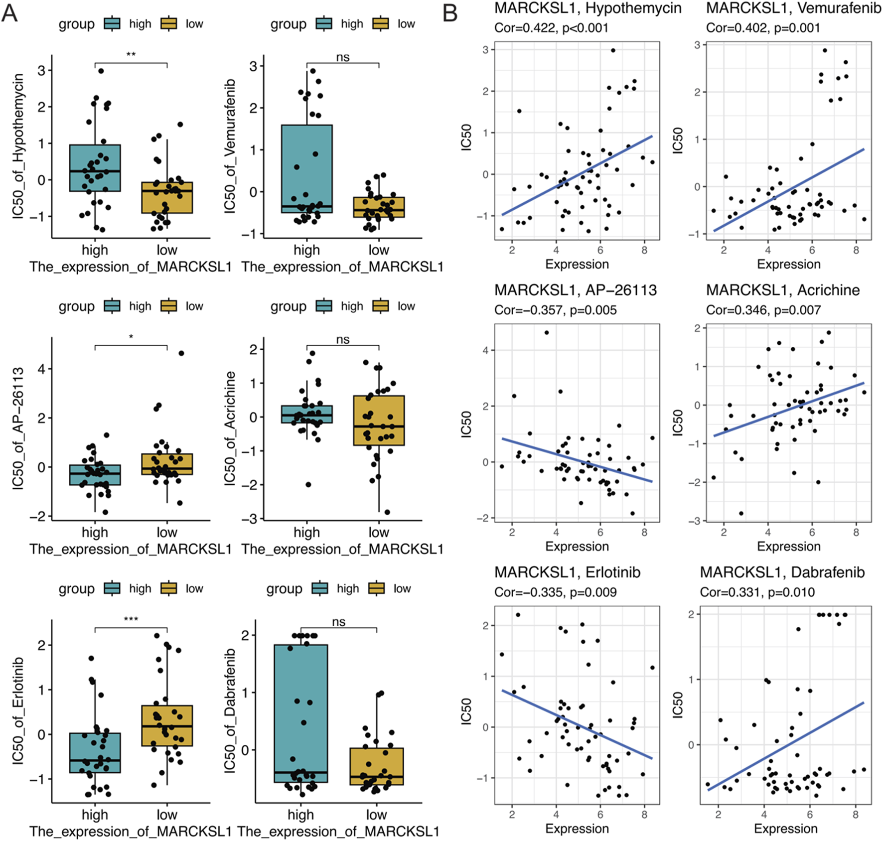 Figure 10. (A) Boxplot illustrating the gene expression and sensitivity to six drugs obtained from the NCI-60 database based on median MARCKSL1 grouping. (B) Investigation of the correlation between the MARCKSL1 expression level in tumour cells and drug sensitivity to six compounds.