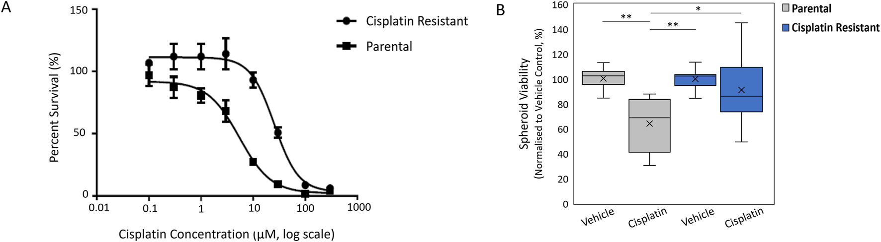 (A) Cell viability curves to determine the IC50 value of cisplatin against Parental SKOV3 and Cisplatin-resistant SKOV3 cells. (B) Spheroid viability normalized to vehicle control of cisplatin against Parental SKOV3 and Cisplatin-resistant SKOV3 spheroids. Data shown is based on a minimum of three biological repeats (n = 3), statistically analysed as parametric data using one-way ANOVA test with Tukey’s multiple comparison test. Significance given as *p < 0.05, **p < 0.01.