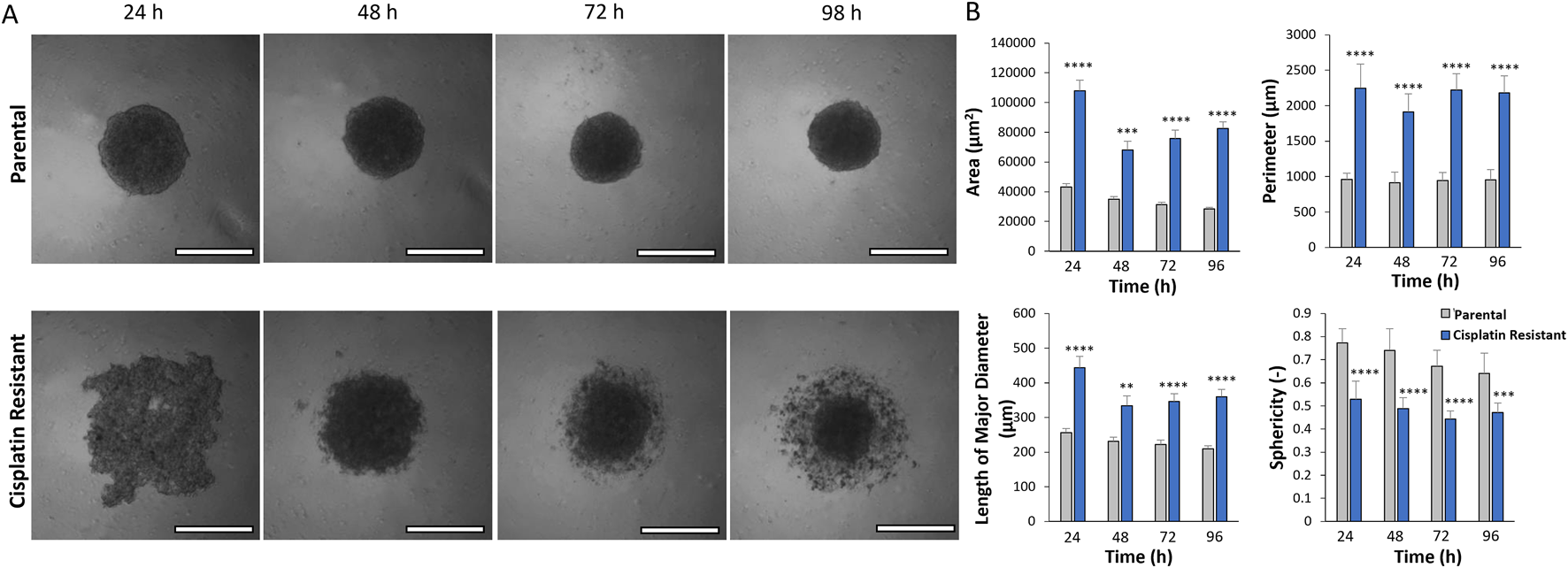 (A) Light microscopy images of parental and cisplatin-resistant SKOV3 spheroids formed over 24–98 h (Scale bar 200 µm). (B) AnaSP analysis of the spheroid light microscopy images to quantify the area (µm2), perimeter (µm), length of the major diameter (µm) and the sphericity (−) of the spheroids. Data is shown as the mean and SD of 21 spheroids and a minimum of three biological repeats (n = 3), statistically analysed as non-parametric data using the Kruskal-Wallis test with Dunn’s multiple comparison test. Significance given as **p < 0.01, ***p < 0.001, ****p < 0.0001.