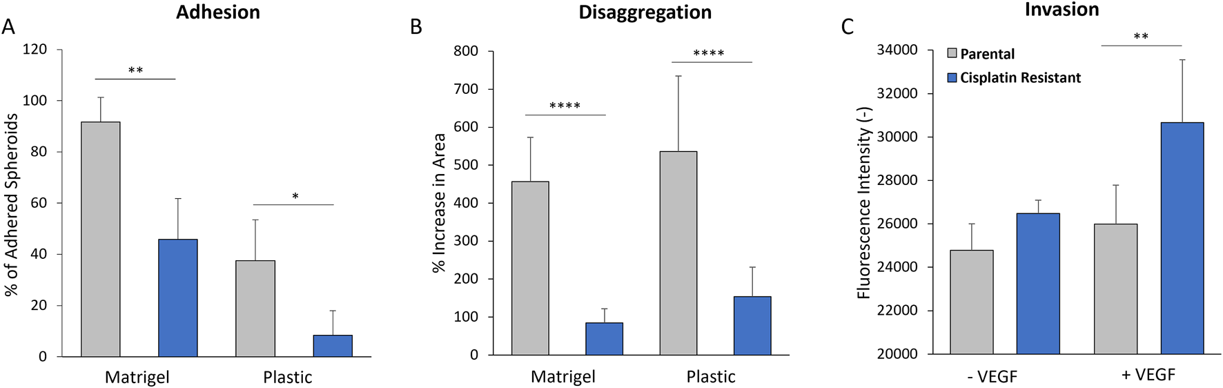 (A) Adhesion of 48 h parental and cisplatin-resistant SKOV3 spheroids to uncoated plastic and Matrigel-coated surfaces after 3 h incubation. (B) Disaggregation of 48 h parental and cisplatin-resistant SKOV3 spheroids on uncoated plastic and Matrigel-coated surfaces after 24 h incubation, as measured by % increase in spheroid area. (C) Invasion of parental and cisplatin-resistant SKOV3 cells through basement membrane-coated transwells in the presence and absence of VEGF, as measured by fluorescence intensity of stained cells in the lower chamber. Data is shown as the mean with a SD of a minimum of six spheroids and a minimum of three biological repeats, statistically analysed as either parametric data using one-way ANOVA test with Tukey’s multiple comparison test or non-parametric data using the Kruskal-Wallis test with Dunn’s multiple comparison test. Significance given as *p < 0.05, **p < 0.01, ***p < 0.001, ****p < 0.0001.