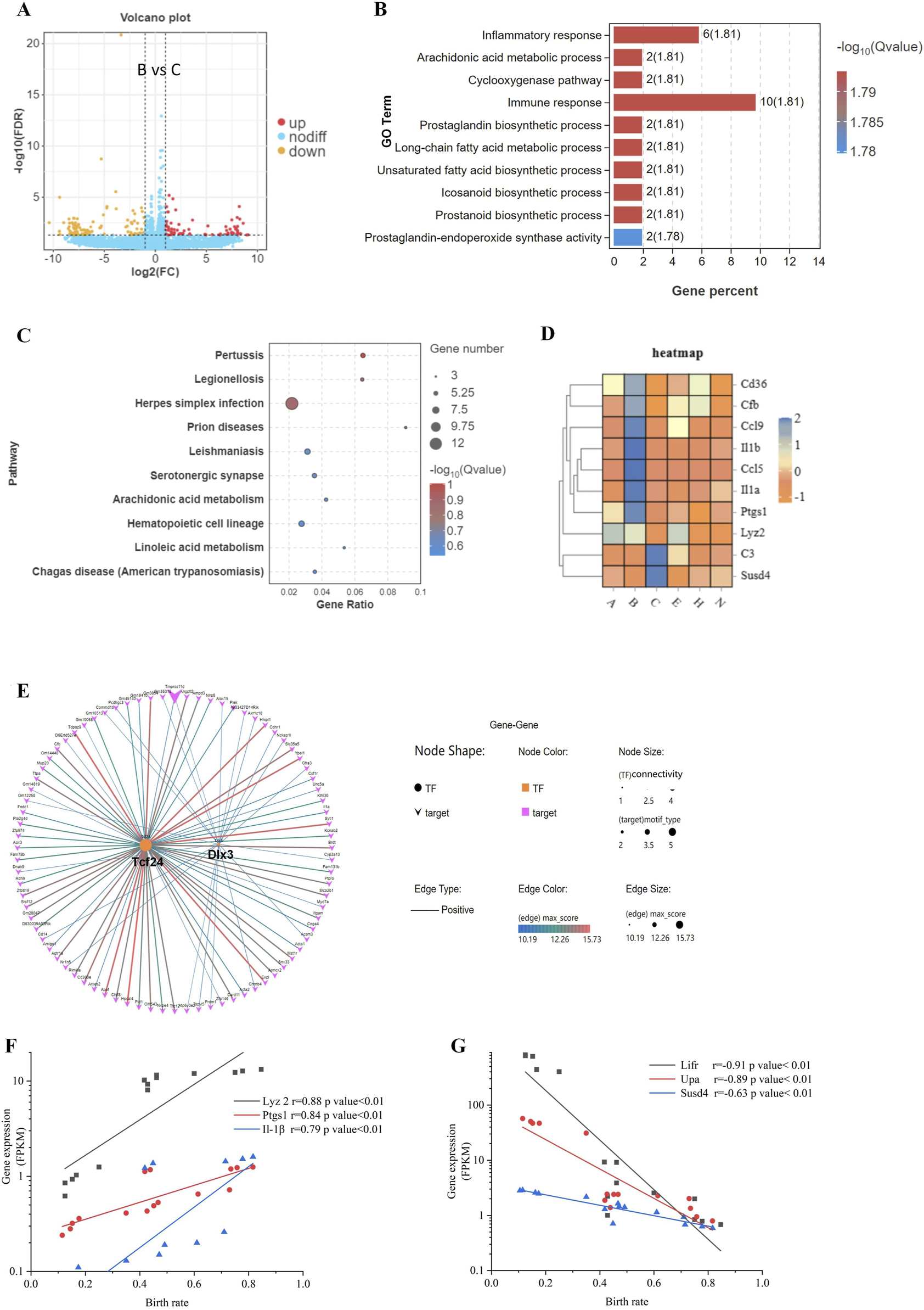 Differences in gene expression during blastocyst hatching and development that affect pregnancy success. (A) The differential gene expression between B and C blastocysts, which had the greatest difference in birth rates (65.6% vs. 21.3%), was analyzed and visualized as a volcano map. (B) DEGs were analyzed by Gene Ontology (GO) functional enrichment for the top 10 significant biological events. (C) The top 10 GO signaling pathways were enriched by the Kyoto Encyclopedia of Genes and Genomes (KEGG) analysis. (D) Expression patterns of immune-related genes, enriched in GO and KEGG, visualized as a heatmap for each blastocyst state. (E) Transcription factor-target gene regulatory network analysis of DEGs identified enriched TFs as Tcf24 and Dlx3. The expression of three upregulated DEGs (F) and three downregulated DEGs (G) was analyzed for correlation with the birth rate.