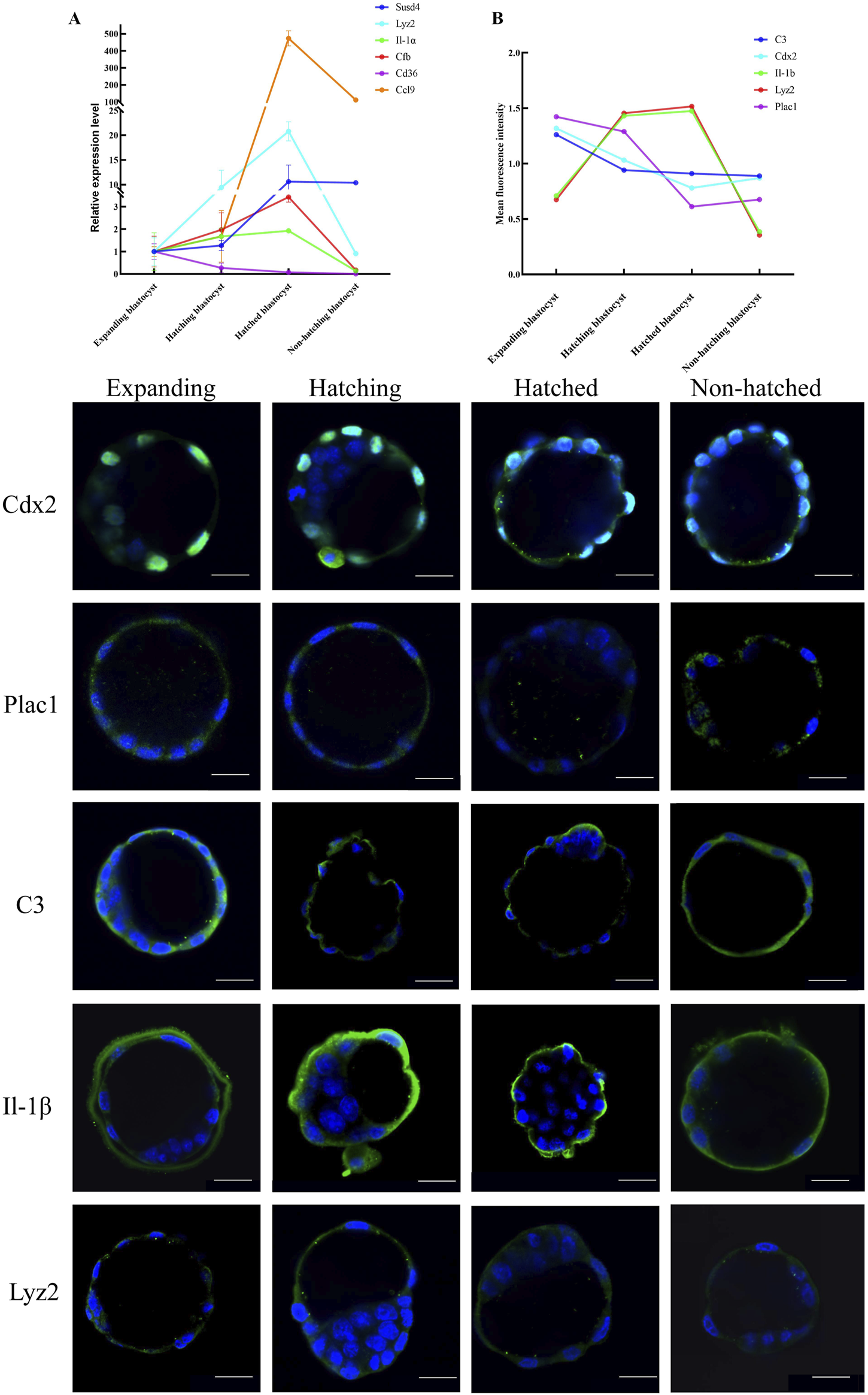 Expression patterns of key genes in embryo hatching. (A) Relative expression of the immune-related genes enriched in KEGG was measured by RT-qPCR expressed as the fold change determined by 2−ΔΔCT normalized the housekeeping gene Gapdh. (B) Protein expression for CDX2, PLAC1, C3, IL-1β, and LYZ2 was determined by green IF staining in embryos imaged by confocal microscopy during the blastocyst hatching process expressed as relative mean fluorescence intensity. All nuclei were labeled with DAPI (blue). Scale bar, 20 μm.