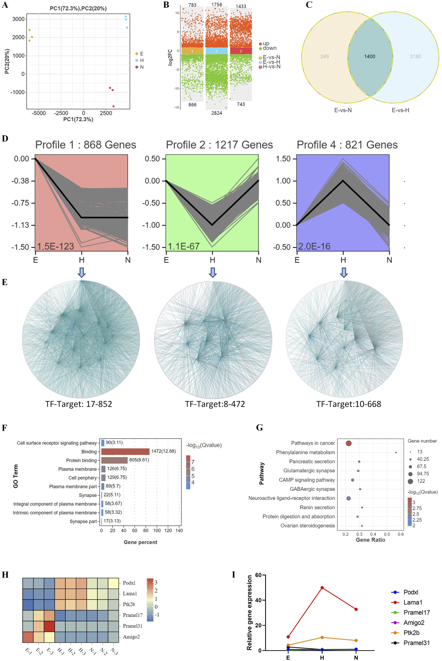 Biological processes associated with changes in transcriptional profiles during development of blastocysts with various hatching outcomes. (A) DEGs were analyzed by PCA in blastocysts with different hatching outcomes. (B) DEGs were compared in hatching blastocysts and non-hatched blastocysts. (C) DEGs were analyzed by Venn diagram among E (expanding), H (hatched), and N (non-hatched) blastocyst; 3,428 genes correlated with different hatching outcomes (circled by dotted line). (D) Trend analysis identified genes with three types of expression profile changes for blastocysts with different hatching outcomes. (E) The genes identified by trend analysis were further analyzed by transcription factor-target gene regulatory network analysis. The genes identified by trend analysis were analyzed by GO functional enrichment for the top 10 significant biological processes (F) and by KEGG pathway enrichment for the top 10 significant signaling pathways (G). (H) The expression patterns of selected genes identified by trend analysis are shown in a heatmap. (I) Transcription of these genes was confirmed by RT-qPCR. The relative expression level shown as fold changes was calculated by 2−ΔΔCT, normalized to the housekeeping gene Gapdh.