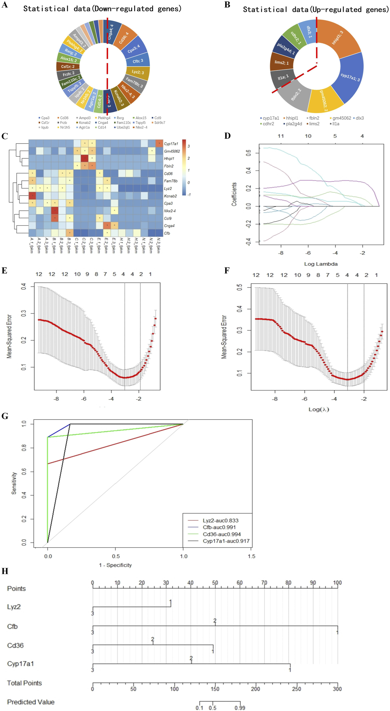 We ranked the DEGs associated with blastocyst development from the transcriptome analysis and identified 13 candidate genes to develop a model to predict blastocyst implantation success. The nine DEGs that were downregulated in three out of four measurements and the four DEGs that were upregulated in two out of three measurements (Figures 6A, B) are shown in a heatmap (Figure 6C). Predictive aggregate effects were identified using LASSO regression (Figure 6D). To determine the gene variables to include in the model and to ensure a rational, effective model, we used LASSO regression analysis using the R language survival and glmnet package, followed by cross-validation of the LASSO analysis results (Figures 6D–F). We screened Lyz2, Cd36, Cfb, and Cyp17a1 as variables using LASSO regression and determined by LASSO Cox regression analysis that these four genes, the minimum value for multivariate Cox modeling, were statistically significant. To determine the predictive performance of the model, we evaluated these genes using receiver operating characteristic (ROC) curve analysis, which showed that they made a significant contribution to the prediction of the model, with area under the ROC curve values generally greater than 0.8 (Figure 6G).