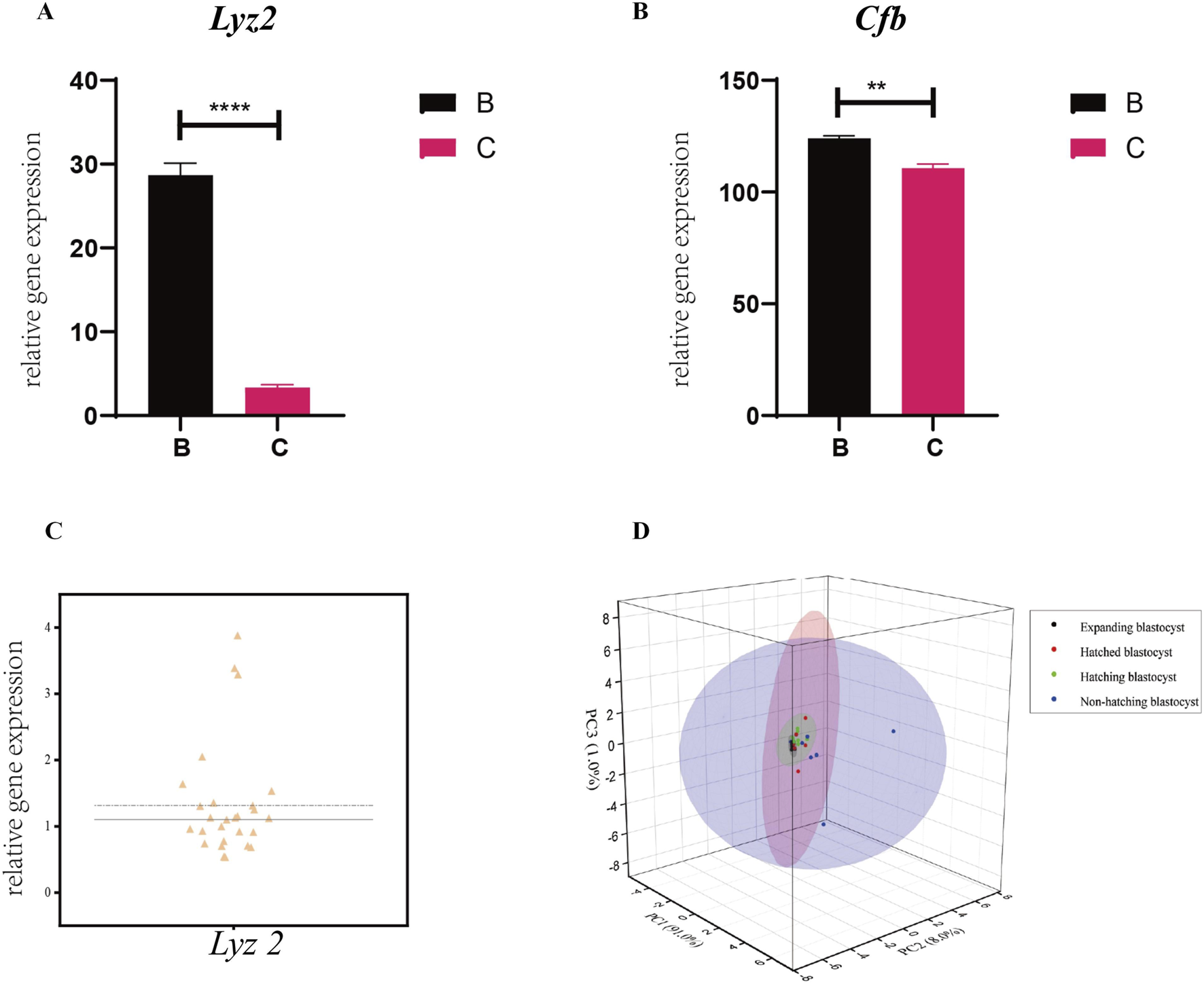 Expression of the genes in the prediction model in single blastocysts. Expression of Lyz2(A) and Cfb(B) was measured by RT-qPCR in single blastocysts hatching at B- and C-sites. All data are represented as mean ± SEM (n = 3). Asterisk denotes statistically significant differences *p < 0.05; **p < 0.01; ***p < 0.001; ****p < 0.0001. (C) Variability in the expression of Lyz2 was observed in different populations of pre-hatching/expanding blastocysts. (D)Lyz2 expression profiles in blastocyst populations at the expanding, hatching, hatched, and non-hatched stages were analyzed by PCA.