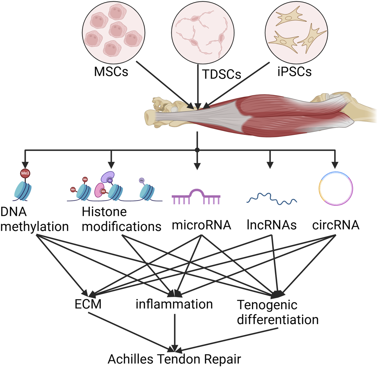 Future studies could focus on the use of specific epigenetic regulators (e.g., DNMT inhibitors or histone deacetylase inhibitors) to target the promotion of tenogenic differentiation of stem cells, as well as standardisation of protocols for enrichment and maintenance of different tendon-derived cell populations. Although the current study initially explored the effects of non-coding RNAs (e.g., miRNAs, lncRNAs, circRNAs), their interactions in multiple epigenetic layers (e.g., binding DNA methylation and histone modifications) remain under-explored. Improved studies of the interactions of multiple epigenetic modifications may greatly assist in the treatment of Achilles tendinopathy and other diseases. Furthermore given that tendon ECM can regulate the fate of tendon stem cells, synergistic effects on stem cell differentiation can be studied by adding decellularized tendon ECM to the culture process.