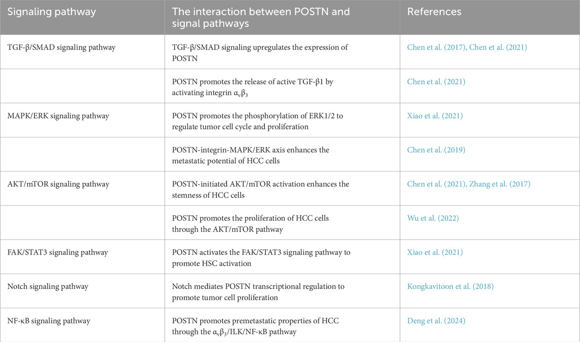 POSTN is expressed in various tissues, including bone, skin, and the heart, but its expression is markedly elevated in pathological conditions, particularly in cancer (Dorafshan et al., 2022; Murota et al., 2017; Valiente-Alandi et al., 2016). The expression level of POSTN is often upregulated and is associated with tumor aggressiveness and poor prognosis in HCC patients (Wang et al., 2024a; Li Z. et al., 2024). Factors such as chronic inflammation, hypoxia, and the activation of signaling pathways (e.g., transforming growth factor β (TGF-β) and interleukin 6 (IL-6)) contribute to POSTN upregulation. POSTN is frequently overexpressed in the HCC TME. It is secreted primarily by cancer-associated fibroblasts (CAFs), activated hepatic stellate cells (HSCs), and, to a lesser extent, tumor cells themselves (Chen et al., 2021; Wang et al., 2024a; Zhang R. et al., 2018). The main function of POSTN in the ECM is to interact with integrins, particularly αvβ3 and αvβ5, which are also upregulated in HCC cells (Xiao et al., 2021). The POSTN-integrin interaction is central to HCC progression, influencing several downstream signaling pathways that support tumor development (Xiao et al., 2021; Wang et al., 2024a).
