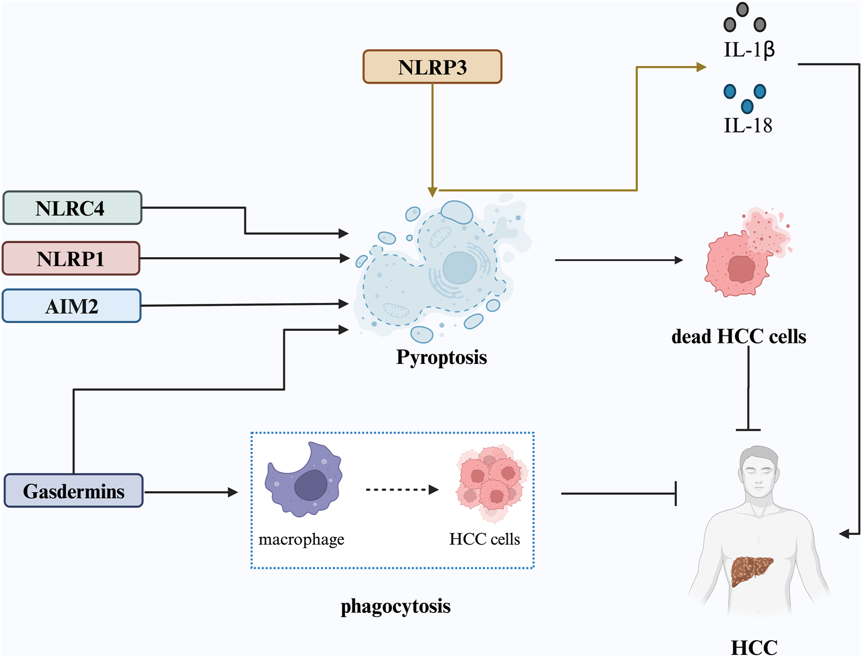 Proposed mechanisms underlying pyroptosis in HCC. Pyroptosis is triggered by inflammasome activation, particularly the NLRP3 inflammasome, leading to the release of IL-1β and IL-18, which fuel the inflammatory cycle in the cancer microenvironment and promote HCC progression. NLRP1, NLRC4, AIM2 inflammasomes, and cleaved gasdermin proteins can also induce pyroptosis, resulting in HCC cell death and inhibition of tumor progression. GSDME expression enhances phagocytosis of tumor cells by tumor-associated macrophages, inhibiting HCC cell growth.