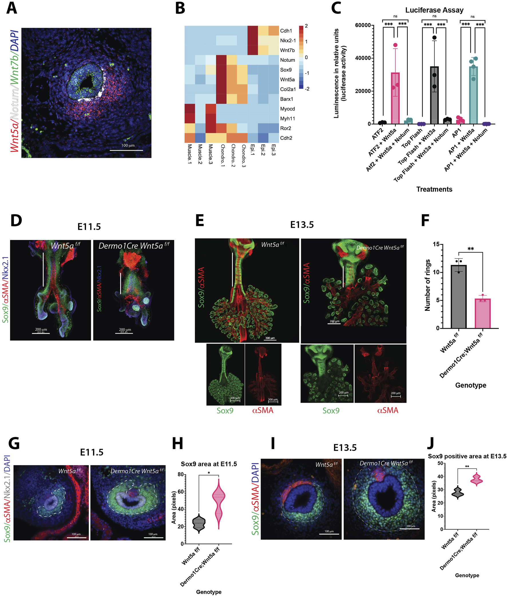 Wnt5a controls cartilage development, while Notum abrogates Wnt5a activity. (A) RNA in situ hybridization of E13.5 cross section depicting the localization pattern of Wnt non-canonical ligand Wnt5a (red) in the ventrolateral region of the trachea mesenchyme, and canonical ligand Wnt7b (green) expressed in the epithelium of the trachea. Notum (white) is located in the mesenchymal, subepithelial region in between Wnt5a and Wnt7b areas of expression. DAPI (blue) was used to stain the nuclei. 40x image. (B) Heatmap of RNAseq from cell sorted tracheal cells isolated at E13.5. Epi. antibody stained EpCAM (+) cells, Muscle. endogenous SMA-eGFP (+) cells, Chondro. EpCAM (−), SMA-eGFP (−) double negative cells. Notum and Wnt5a are expressed in chondroblast cells, identified by the expression of chondrogenic genes: Col2a1 and Sox9. Otherwise absent in muscle and epithelial cells. (C) Luciferase assay performed on NIH3T3 cells transfected with ATF2, TOP Flash or AP1 reporter constructs. Co-transfection of Wnt5a expression plasmid increases the luciferase activity by the ATF2/AP1 constructs. In case of Wnt3a expression plasmid, it increases the luciferase activity by the TOP Flash construct. In all cases, when Notum expression plasmid is also added, this luciferase induction is abrogated. In this in vitro assay, Notum can dampen the activities of canonical (Wnt3a) and non-canonical (Wnt5a) ligands. n = 3 for each treatment group. ***p < 0.001, ns non-significant statistical differences. One-way ANOVA (D–E) Wholemount immunofluorescence (IF) of dissections of larynx-trachea-lungs at (D) E11.5 and (E) E13.5 of control (Wnt5a f/f) and Wnt5a mutants (Dermo1cre; Wnt5a f/f). Sox9 (green) is expressed in chondroblasts and epithelial cells of the distal lung. αSMA (red) is localized in muscle cells of the dorsal trachea and bronchi. This expression pattern is maintained in Wnt5a mutants compared to controls, but the trachea is shorter in length (white vertical full line) with defects in lung lobation noticeable by E13.5. At E11.5, there is no evidence of ring formation as noticed by the Sox9 (+) continuum observed in the trachea mesenchyme. At E13.5, Sox9 (+) cells in the trachea appear more defined in rings for Wnt5a mutants than controls. Dorsal trachea muscle cells (αSMA (+) show defects in orientation, particularly towards the proximal region, closer to the larynx. Scale bars: 200 um for E11.5 samples, 300 um for the E13.5 control image, and 200um for the E13.5 Wnt5a mutant image. Single channels are shown for whole mounts at E13.5 (F) Reduction in the tracheal ring number by E14.5 in mutans vs. controls. n = 3 for each genotype. **p < 0.01 (G) IF of cross sections of control and Wnt5a mutant at E11.5. Chondroblasts are Sox9 (+) (green), muscle cells are αSMA (+) (red), and respiratory epithelial cells are Nkx2.1 (+) (grey). In wnt5a mutants Sox9 (+) area is larger than the controls. (H) Sox9 staining intensity quantification of (G) within the area delimited by a dashed white line. n = 3 *p < 0.05 (I) IF of cross sections of E13.5 embryos. Sox9 (+) (green) area (delimited by a dashed white line) is larger in Wnt5a mutants compared to controls. Sox9 expression also extends dorsally. Muscle cells (αSMA (+), red) are organized differently in Wnt5a mutants vs. controls. 40x images. (J) Sox9 staining intensity quantification of (I) within the area delimited by a dashed white line. n = 3 **p < 0.01.