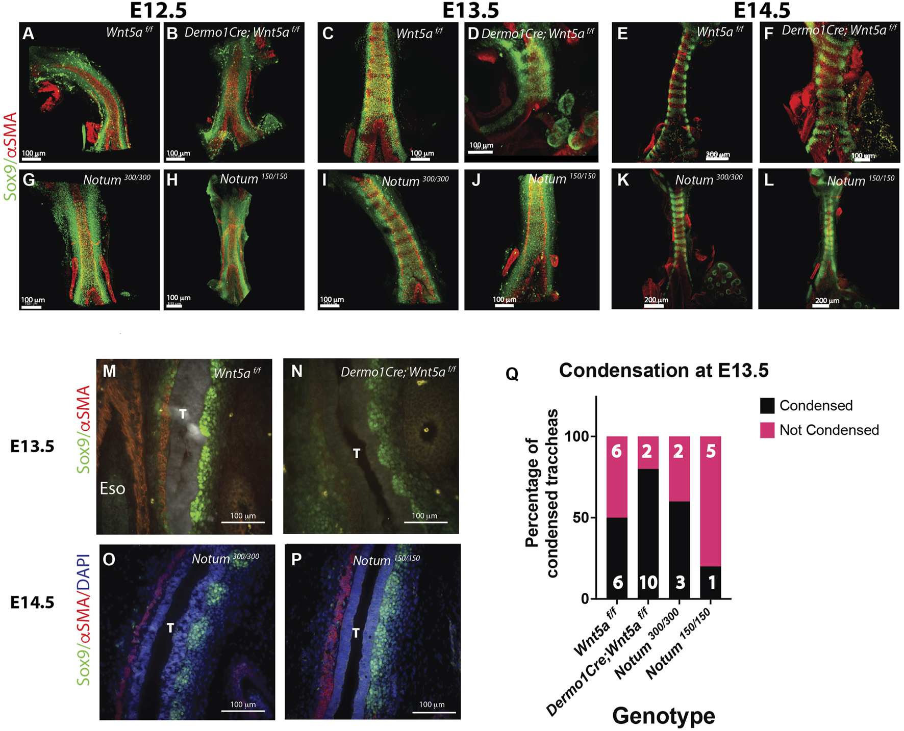 Finally, it should be taken into consideration the likely heterogeneity of the Sox9 positive cells in the tracheal mesenchyme. The heterogeneity of the cells may affect their response to Wnt5a and Notum signaling during the condensation process; however, this analysis is beyond the scope of this study and will be addressed in a follow up manuscript using single cell sequencing.