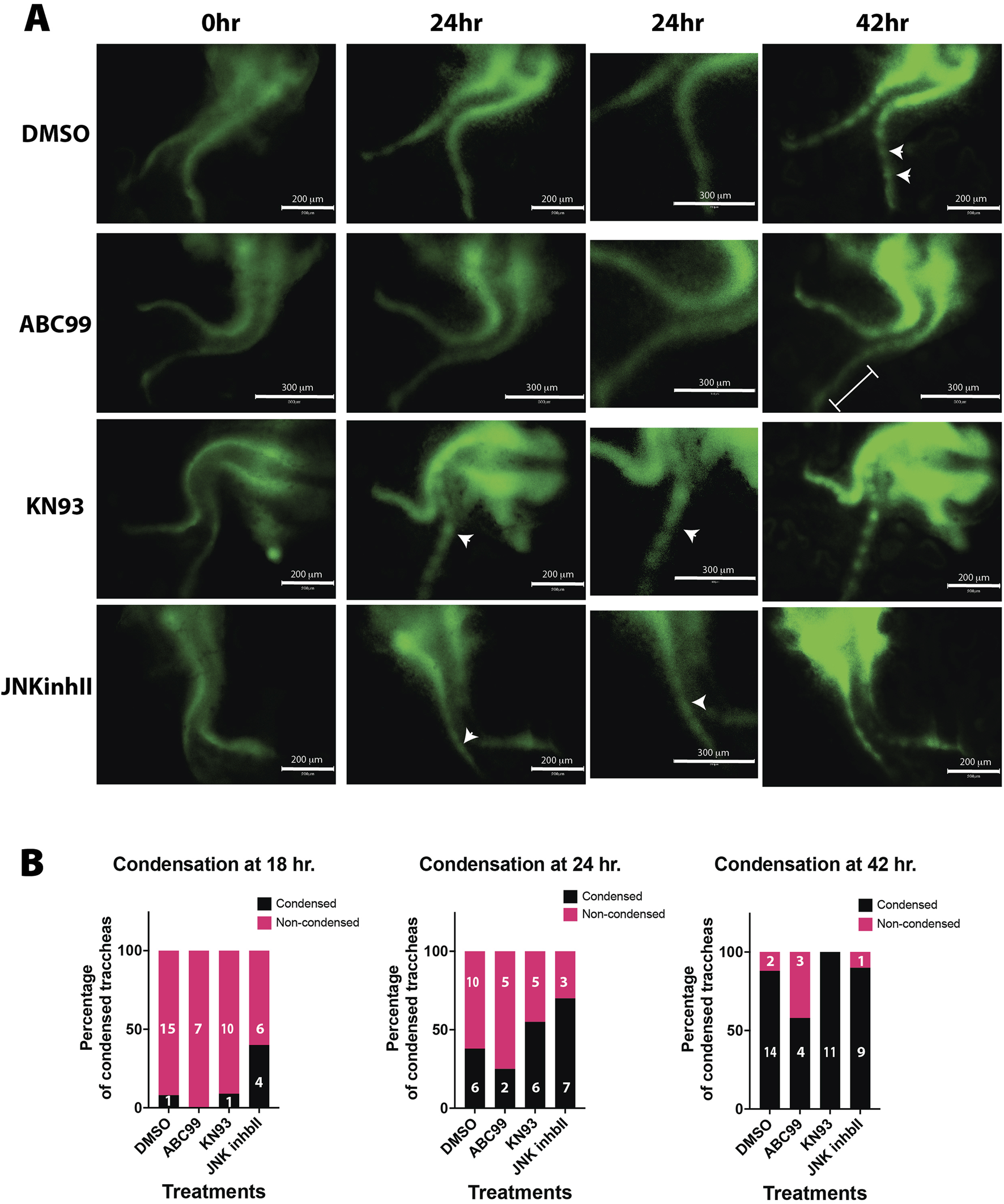 Pharmacological treatments recapitulate Wnt5a-deficient and Notum-deficient phenotypes ex vivo. (A) Timelapse imaging of larynx-trachea-lung dissected tissue from E12.5 embryos grown ex vivo in Air Liquid Interphase (ALI). Endogenous expression of Sox9KIeGFP was used to visualize the moment of cell condensation that precedes the formation of cartilage. Condensations in ex-vivo explants were defined as SOX9 GFP + cells that formed aggregates and became segmented as time progressed. Vehicle treated tissue (DMSO) shows signs of condensation at 42 h of incubation (white arrows). This phenomenon is absent when Notum is chemically inhibited (ABC99) (white bracket). Inhibitors of the Wnt non-canonical pathway, Calmodulin Kinase inhibitor (KN93) and JNK inhibitor (JNKinhII), induce earlier signs of Sox9KIeGFP (+) condensations at 24 h (white arrows), earlier than vehicle treated samples. Scale bar 300 um. Digital zoom for images at 24 h is shown, scale bar 150 um. (B) In a frequency analysis from the ALI cultured samples, we observed a trend towards a higher percentage of condensations as early as 18 h in JNKinhII treated samples compared to vehicle treated samples. At 24 h KN93 and JNKinhII show higher percentages of tracheal condensations than vehicle treated samples. ABC99 treated samples show a reduced percentage of tracheal condensations at 18, 24 and 42 h compared to vehicle or other treatments. n = 7–16 for each treatment.