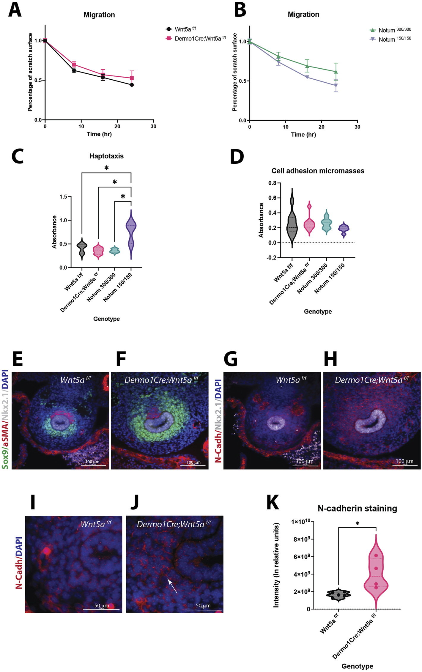 Wnt5a and Notum deletion have unique effects in cell behavior. (A)Migration assays of E13.5 primary mesenchymal tracheal cells show no statistical differences in cell motility between Wnt5a controls (Wnt5af/f, black circles) and Wnt5a mutants (Dermo1cre; Wnt5af/f, pink squares). (B)There is a trend towards a higher motility of Notum mutants (Notum 150/150, purple triangles) compared to Notum controls (Notum 300/300, green triangles) at 16 and 24 h n = 3 for each genotype. (C)Haptotaxis assays of E13.5 primary mesenchymal tracheal cells show an increase in directional cell migration towards fibronectin for Notum mutants (purple) compared to Notum controls (green) and other genotypes. Wnt5a mutants (pink) do not show a difference in directional cell migration compared to Wnt5a controls (black). n = 3 per genotype. *p < 0.05 One-way ANOVA. (D)Cell adhesion in micromasses from E13.5 primary mesenchymal tracheal cells showed no differences in the genotypes analyzed. n = 6–9 per genotype. (E–J)Immunofluorescence stainings of E11.5 cross sections. Sox9 (+) (green) area is larger in Wnt5a mutants (F)compared to controls (E). N-cadherin (N-cad, red) is increased in Wnt5a mutants (H)compared to controls (G). Respiratory epithelium identity is maintained (Nkx2.1, white). 40x images. N-cadherin expression is stronger in the cell-cell interphase of dorso-lateral mesenchymal cells in mutants (J)compared to controls (I). 100x oil immersion images. DAPI (blue) was used to stain the nuclei. (K)N-cadherin intensity quantification normalized to Sox9 + area of the experiments presented in (E–J)shows an increase for Wnt5a mutans (pink) compared to controls (black). n = 4–5 per genotype, *p = 0.01 T-test.