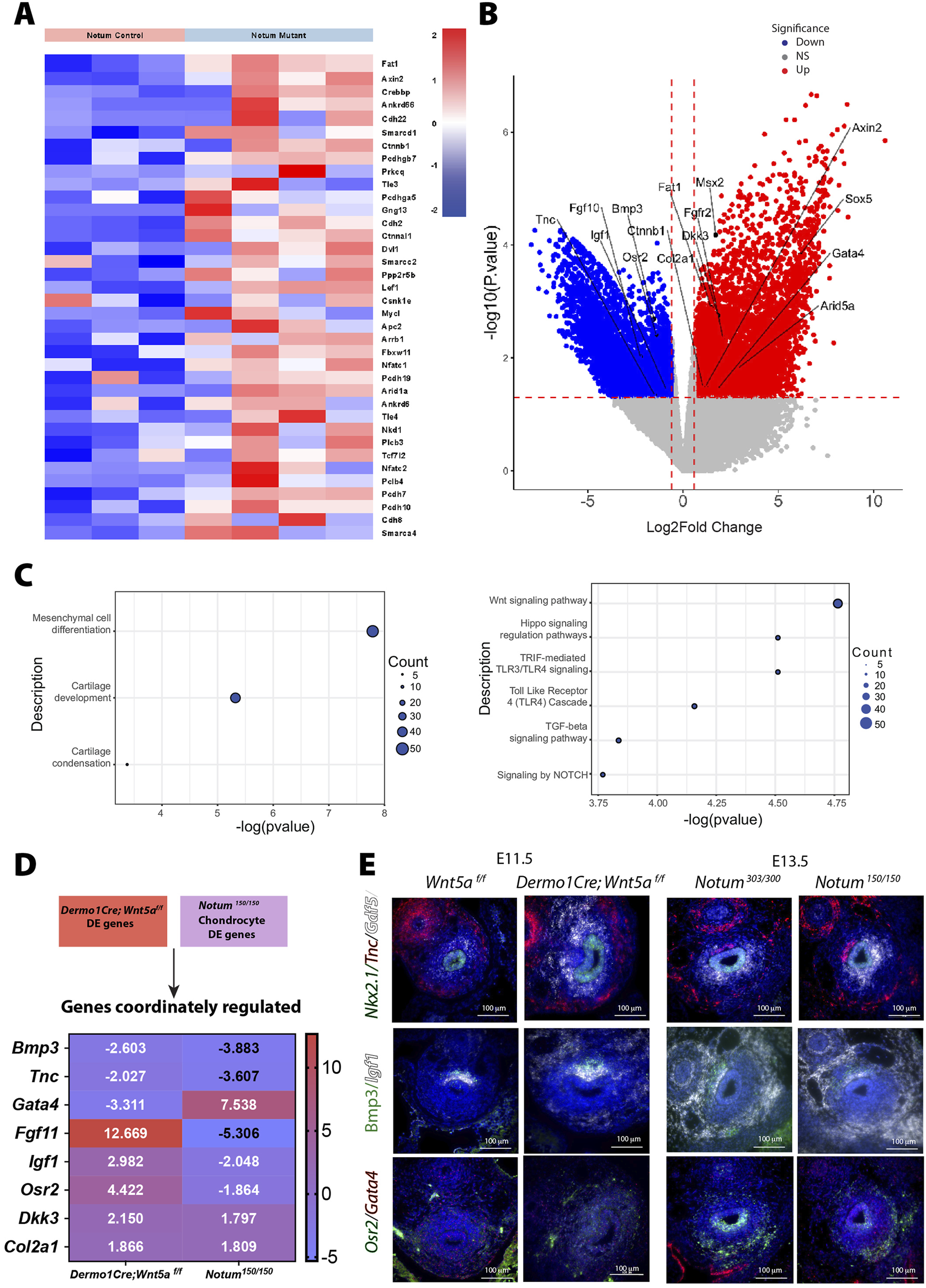 Notum differentially regulates Wnt signaling pathway and cartilage development. (A) Heat map demonstrates differential expression of Wnt signaling pathway genes among Notum control (Notum 300/300) and mutant (Notum 150/150) cells of the tracheal chondroblasts at E13.5. The dataset reveals increased expression of Axin2, Ctnnb, Dkk3, and Dvl1. (B) Volcano plot depicting genes of interest in Notum mutant (Notum150/150) vs. control (Notum300/300) which have been differentially regulated in tracheal chondroblasts. Blue: downregulated, red: upregulated genes. NS: non-significant. (C) Bubble plots depicting Notum biological processes and pathway enrichments with significance are shown. (D) Heatmap of common genes differentially regulated in cells of Dermo1Cre;Wnt5af/f and Notum150/150 chondrocytes. Gata4 appears more upregulated in Notum cells while Fgf11 and Osr2 appear more upregulated in Dermo1Cre;Wnt5af/f cells. Blue: downregulated, red: upregulated genes. (E) RNA in situ hybridization depicts localization of transcripts for Nkx2.1, Tnc, Gdf5, Bmp3, Igf1, Osr2, and Gata4 in transverse sections of E11.5 Wnt5af/f, Dermo1Cre;Wnt5af/f, E13.5 Notum303/300, and Notum150/150 tracheas. Osr2 appears to be more abundant at E13.5 in control tracheas and to some degree in Wnt5a mutant tracheas. Gdf5 appears more abundant in E11.5 Wnt5a mutant tracheas and in E13.5 controls which validates previous RNAseq findings.