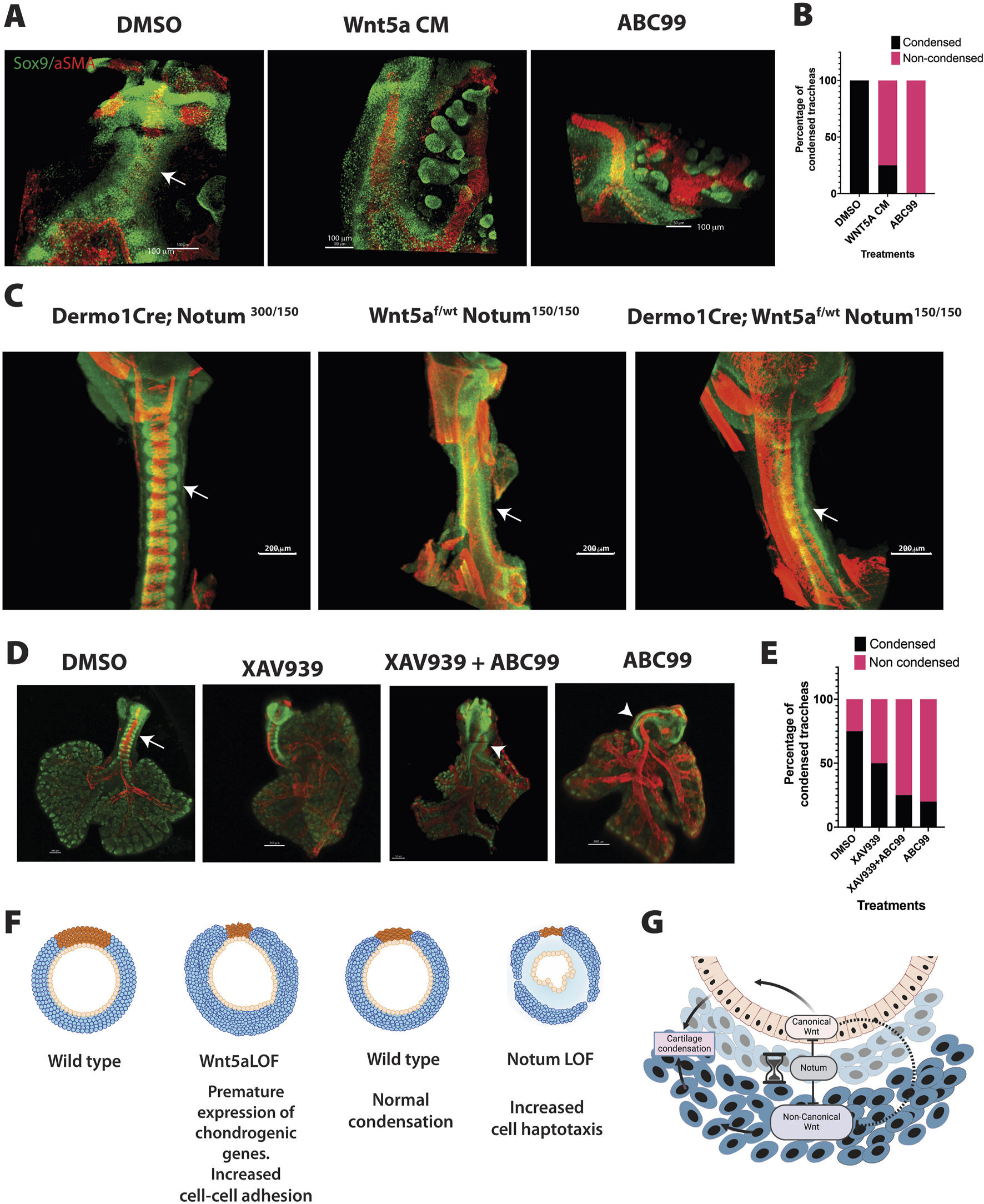 Integration of Wnt5a and Notum activity influence tracheal cartilaginous ring patterning. (A) Whole mount immunofluorescence imaging of wild type tracheal lung explants are depicted after 42 h after ALI cultures. Sox9 (green) is expressed in chondroblasts and epithelial cells of the distal lung. αSMA (red) is localized in muscle cells of the dorsal trachea and bronchi. In vehicle treated tracheas, condensations were clearly observed at 42 h (arrow DMSO). In contrast, addition of Wnt5a conditioned media in media culture prevented the formation of cartilaginous mesenchymal condensations, recapitulating the phenotype obtained after treatment with ABC99, a Notum inhibitor. (B) Frequency analysis depicting the effects of the treatments based on the whole mount images represented in (A). N = 4–8 per treatment. (C) Whole mount immunofluorescence of E13.75 embryos of a Notum Wnt5a allelic series demonstrating the rescue of the timing of mesenchymal condensations by decreasing the Wnt5a expression in Notum deficient background (Dermo1Cre; Wnt5af/wt; Notum150/150) as demonstrated by the Sox9 staining (green). Images are representative of embryos from three different litters. (D) Whole mount immunofluorescence imaging of wild type tracheal lung explants are depicted after 42 h after in ALI cultures. In vehicle treated tracheas, condensations were clearly observed at 42 h (arrow DMSO). While addition of ABC99 prevented the formation of cartilaginous mesenchymal condensations, combined addition of XAV939 with ABC99 did not have effect in rescuing the lack of mesenchymal condensations (arrowhead). (E) Frequency analysis depicting the effects of the treatments based on the whole mount images represented in (D). N = 4–5 per treatment. (F) The cartoon summarizes the effects of deletions of Wnt5a and Notum in mesenchymal cell condensation and cartilage. Deletion of Wnt5a (Wnt5a LOF) causes premature condensation of chondroblasts associated with increased cell-cell addition and the premature expression of genes promoting mesenchymal condensations at E11.5. On the other hand, after deletion of Notum (Notum LOF), mesenchymal condensations are delayed in association with increased cell directional migration at E13.5. In both models, the normal morphology of the cartilage is disrupted. (G) Proposed model integrating Notum, Wnt5a and Wnt/β-catenin signaling based on findings from this work and previously published studies. Notum balances Wnt signaling in developing trachea by directly inhibiting the activity of both Wnt5a-mediated signaling and Wnt/β-catenin signaling. Indirectly, by modulating activity of canonical Wnt signaling, Notum may also influence canonical Wnt signaling competition with non-canonical Wnt signaling. Created with BioRender.com.