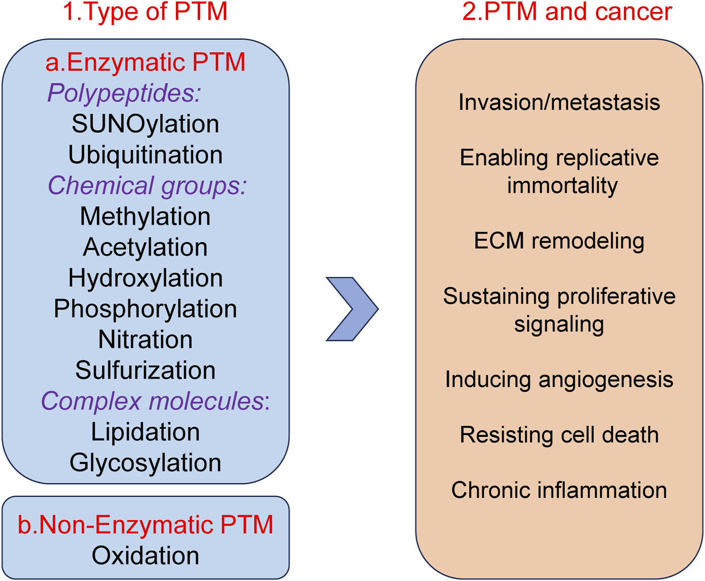 Well-known examples of PTM and Pathogenesis implications of PTM in cancer.