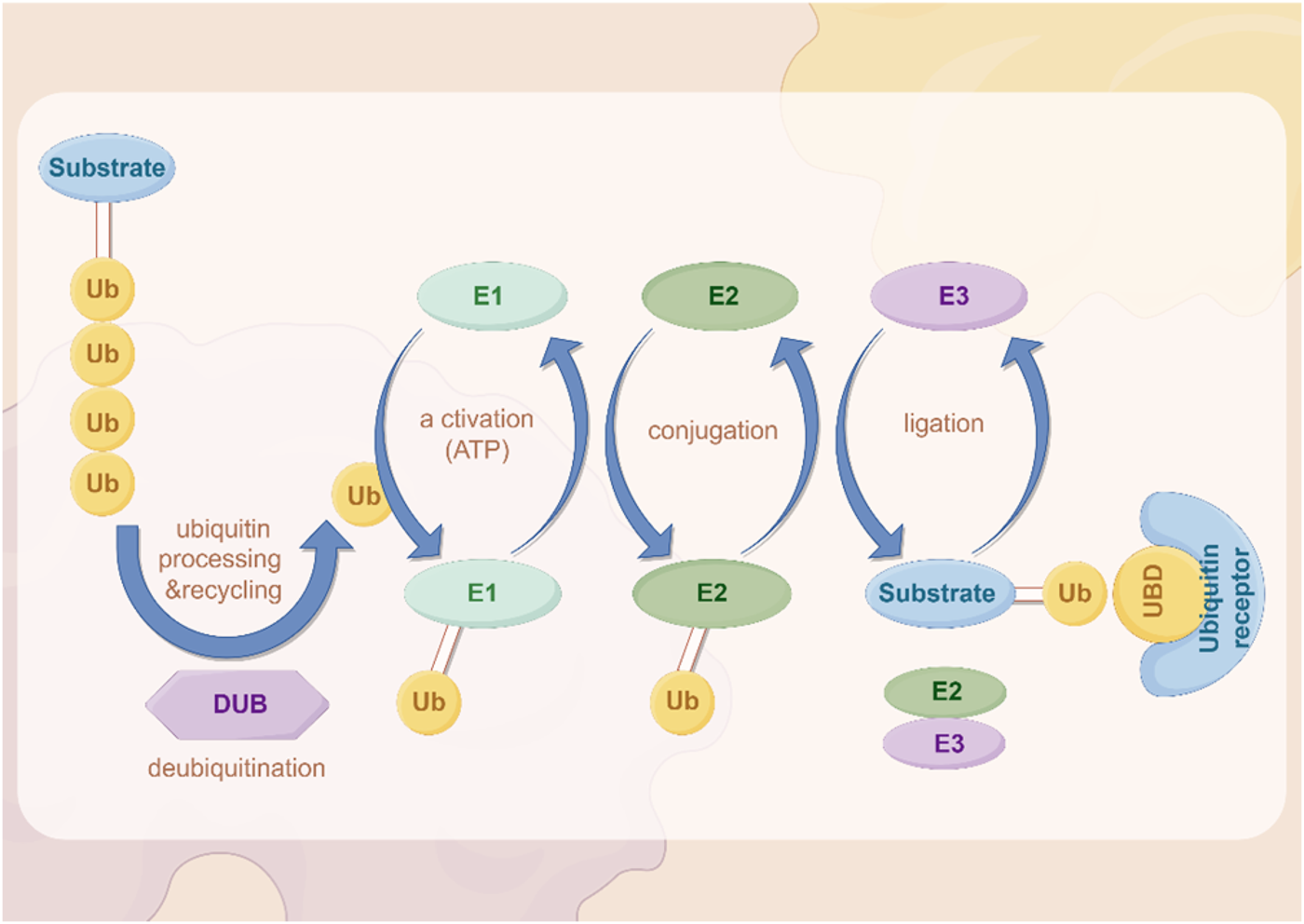 Ubiquitin complexes can be degraded by ubiquitinases, and this process is reversible, with deubiquitinases (DUBs) removing ubiquitin molecules from target proteins (Harrigan et al., 2018; Dewson et al., 2023). DUBs recover ubiquitin by hydrolyzing the heteropeptide bond between ubiquitin and target proteins, regulating protein degradation and cellular function (Mevissen and Komander, 2017). This step plays an important role in maintaining cellular homeostasis and regulating protein degradation balance.