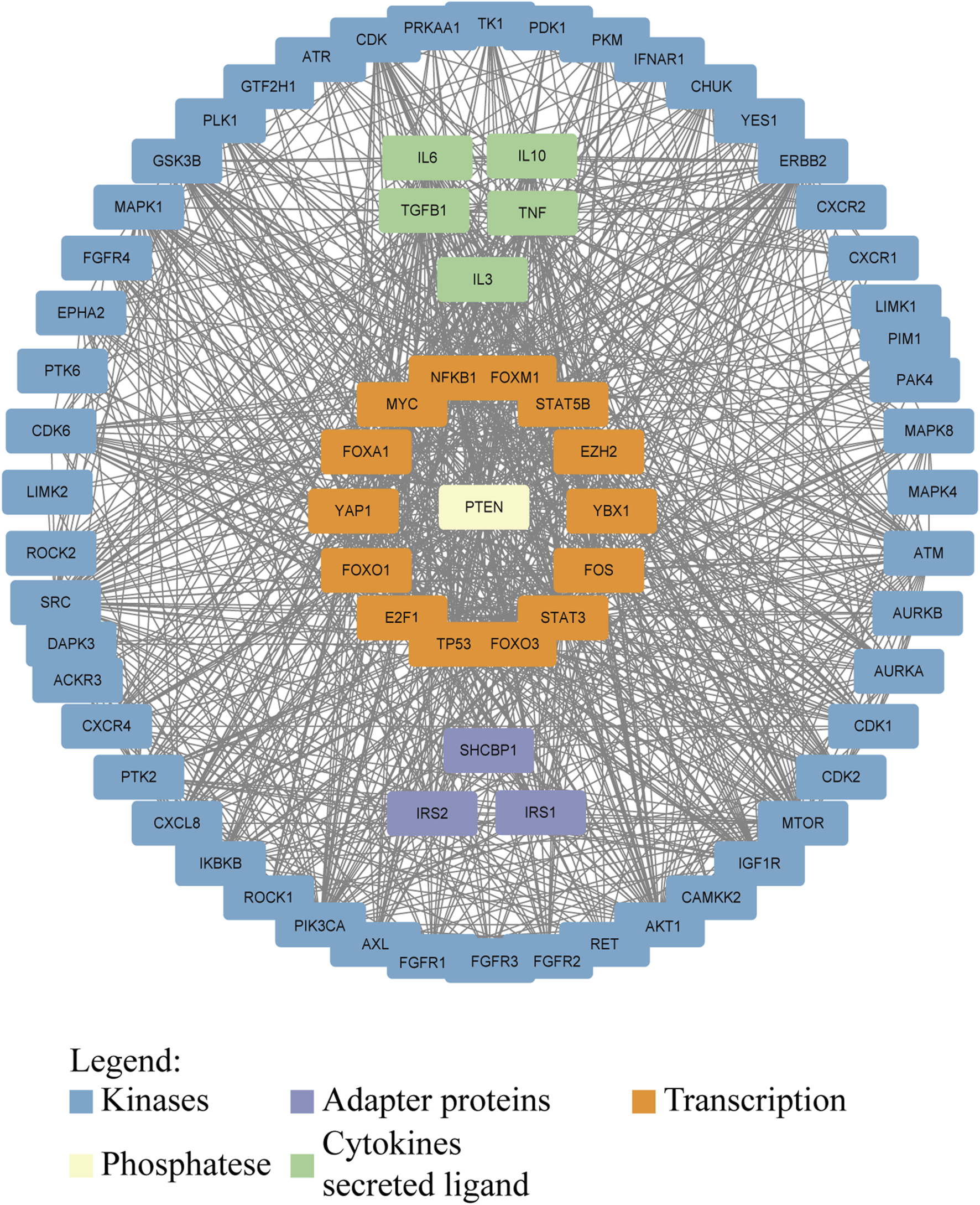 Interaction network of proteins involved in or affected by phosphorylation in GC. Kinases, adapter proteins, and transcription factors are shown to visualize the network that drives GC progression. Protein–protein interactions were downloaded from the STRING database (https://cn.string-db.org/) and visualized in Cytoscape.