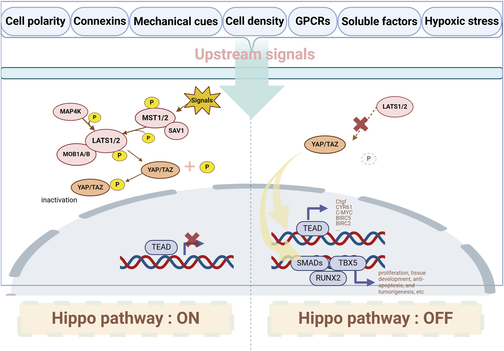The main components of the Hippo pathway include MST1/2 kinases (Mammalian sterile 20-like kinase 1/2, MST1/2), Salvador homolog 1 (SAV1), MOB kinase activator 1A/B (MOB1A/B), large tumor suppressor 1/2 (LATS1/2), Yes-associated protein 1 (YAP1 or YAP), transcriptional co-activator with PDZ-binding motif (TAZ, also known as WWTR1), and the transcriptional enhanced associate domain family (TEAD) (Ma et al., 2019) (showed in Figure 2). MST1/2, SAV1, MOB1A/B, and LATS1/2 form the upstream kinase cascade of the Hippo pathway, while YAP/TAZ acts as the key downstream effectors. When the Hippo pathway is inactive, YAP is dephosphorylated and translocates into the nucleus, where it binds to transcription factors TEAD1-4 to regulate gene expression (Hansen et al., 2015). YAP has two main isoforms: YAP1 (Szulzewsky et al., 2021) and YAP2 (Oka and Sudol, 2009), with YAP1 being the predominant form. YAP1 is expressed in various cell types and, through TEAD binding, regulates the expression of genes involved in cell proliferation, apoptosis, and stem cell self-renewal (Driskill and Pan, 2023). The downstream target genes regulated by YAP include those associated with cell proliferation, such as Ctgf (Moon et al., 2020), CYR61 (Zhang C. et al., 2024), C-MYC (Xiao et al., 2013), ANKRD1 (Wu et al., 2023), and AXL (Okamoto et al., 2023); and apoptosis inhibitors, such as MCL1 (Glinkina et al., 2023), BIRC5 (Edwards et al., 2023) and BIRC2 (Wang Y. et al., 2022). Like YAP1, YAP2 can bind TEAD transcription factors, but its specific functions and regulatory mechanisms are not completely understood (Khanal et al., 2018). Besides TEADs, YAP also interacts with runt-related transcription factor 2 (RUNX2) (Chuang and Ito, 2021), T-box transcription factor 5 (TBX5) (Rosenbluh et al., 2012), and SMADs (Liu H. et al., 2023), promoting their downstream gene transcription, playing a role in cell proliferation, tissue development, anti-apoptosis, and tumorigenesis. Various upstream signals, such as cell polarity complexes, connexins, mechanical cues, cell density, G protein-coupled receptors (GPCRs), soluble factors, receptor tyrosine kinases (RTKs), tight junctions, adherens junctions, integrins, and hypoxic stress, can regulate the Hippo pathway (Fu et al., 2022).
