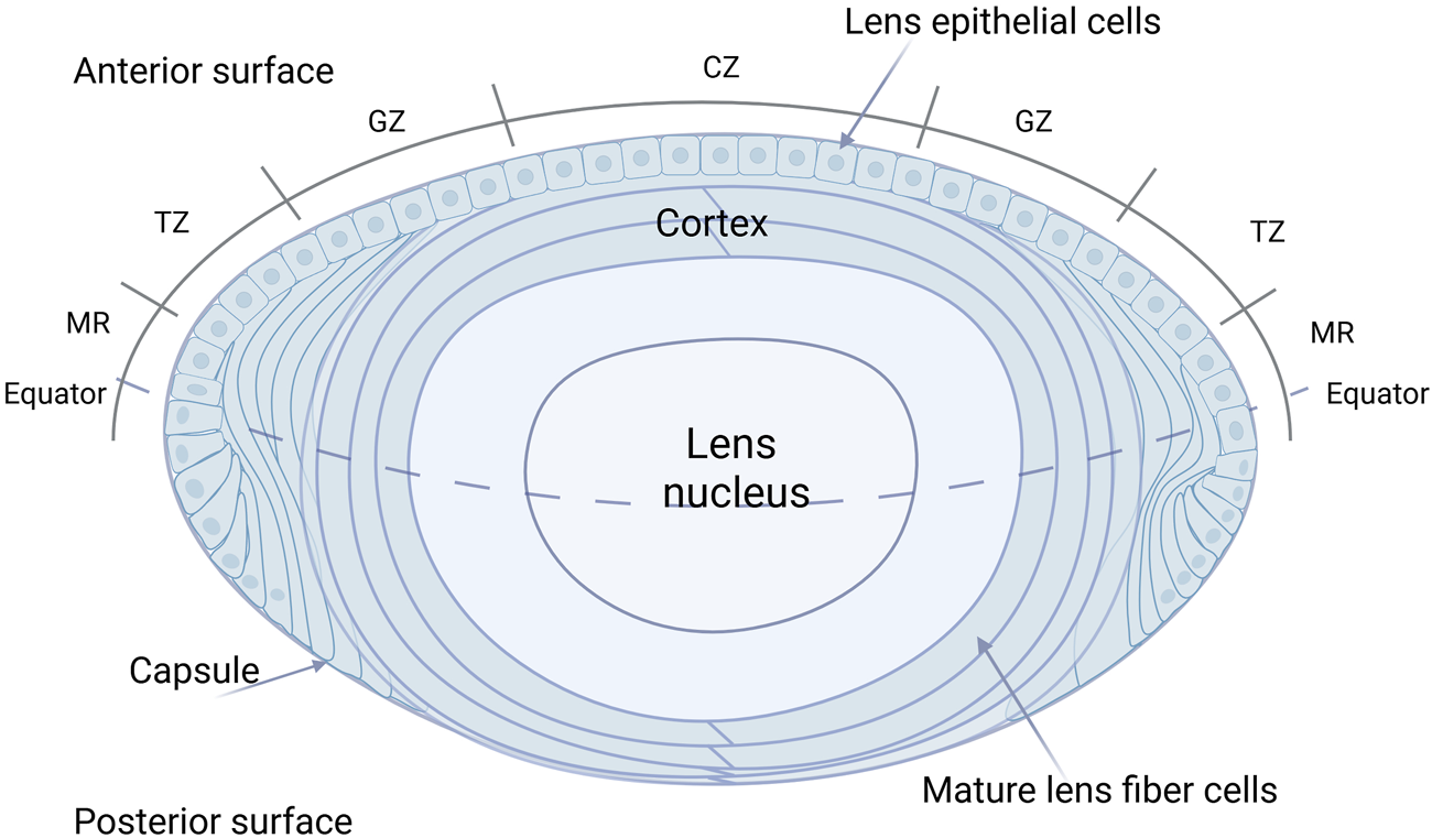 Detailed anatomy of the human eye lens. The LECs located at the anterior side of the equatorial plate proliferate and migrate towards the equatorial region, differentiating into secondary LFCs. The proliferation of LECs occurs in the region above the lens equator, known as the Germination Zone (GZ). The progeny of dividing cells migrate or are displaced from the lens equator below the equator into the Transition Zone (TZ), where they differentiate into fiber cells. During terminal differentiation, LECs exit the cell cycle and degrade subcellular organelles, including the nucleus, ultimately forming mature LFCs with the organelle-free zone (OFZ). CZ: Center zone; GZ: Germinative zone; TZ: Transition zone; MR: Meridional rows.