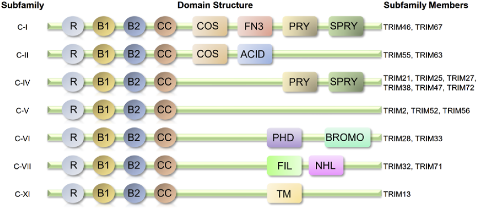 Structural schematic of the TRIM protein family with definite structural data mentioned in this paper (classified by structure). Almost all-related TRIM proteins have a RING-finger domain (R), one or two B-box domains (B) and a coiled-coil domain (CC). ACID, acid-rich region; BROMO, bromodomain; COS, cos-box; FIL, filamin-type I G domain; FN3, fibronection type III repeat; NHL, NCL1, HT2A and LIN41domain; PHD, PHD domain; PRY, PRY domain; SPRY, SPRY domain; TM, transmembrane region.