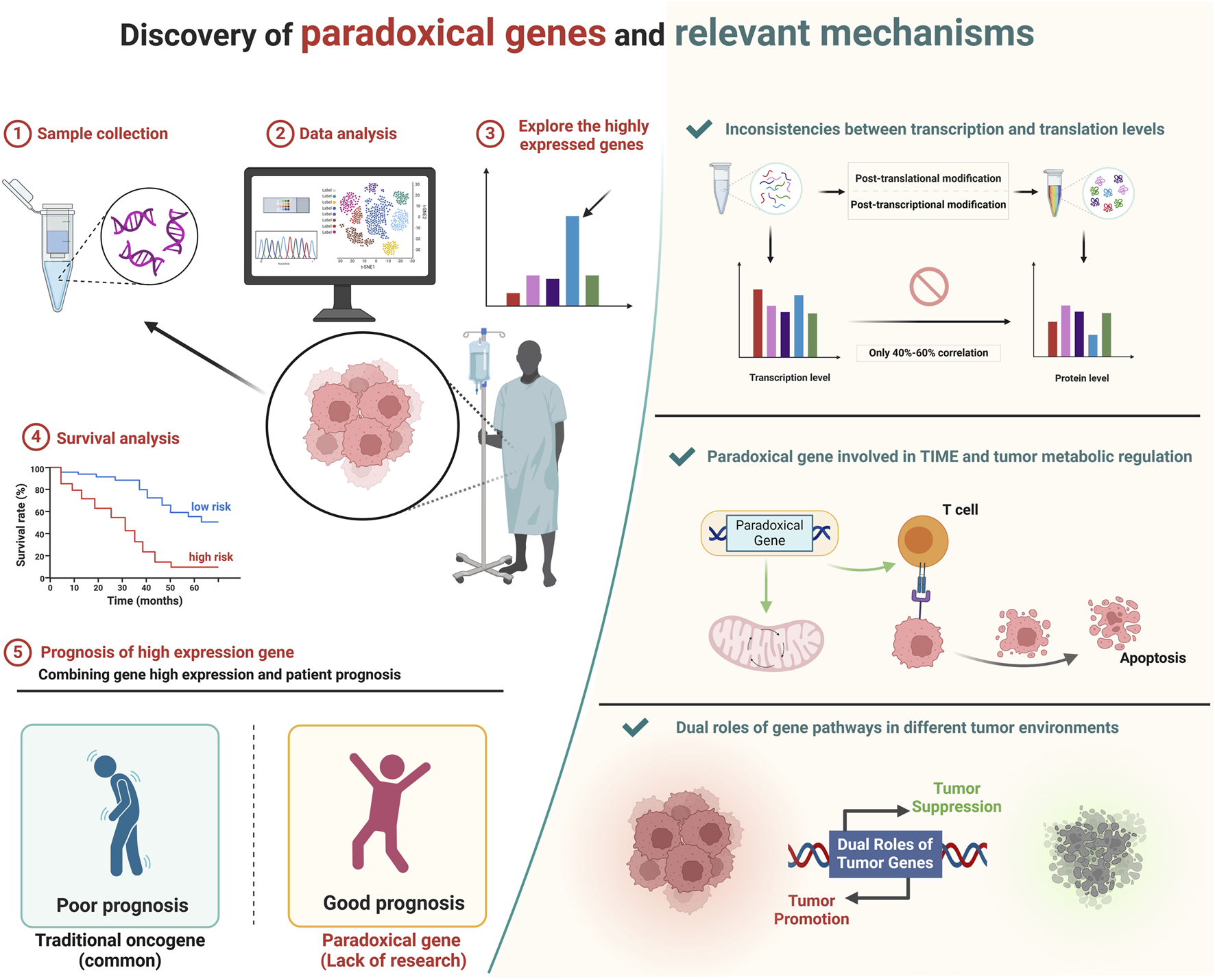 Typically, oncogenes show higher expression in tumors and are linked to poor prognoses. However, some highly expressed genes in tumors are associated with better outcomes and act as tumor suppressors, termed paradoxical genes. We explored these genes using bioinformatics, revealing their significant roles in regulating tumor metabolism and immune microenvironments, offering new insights for targeted cancer therapy. Created in BioRender. ZHAO, X. (2025) https://BioRender.com/b00e214.