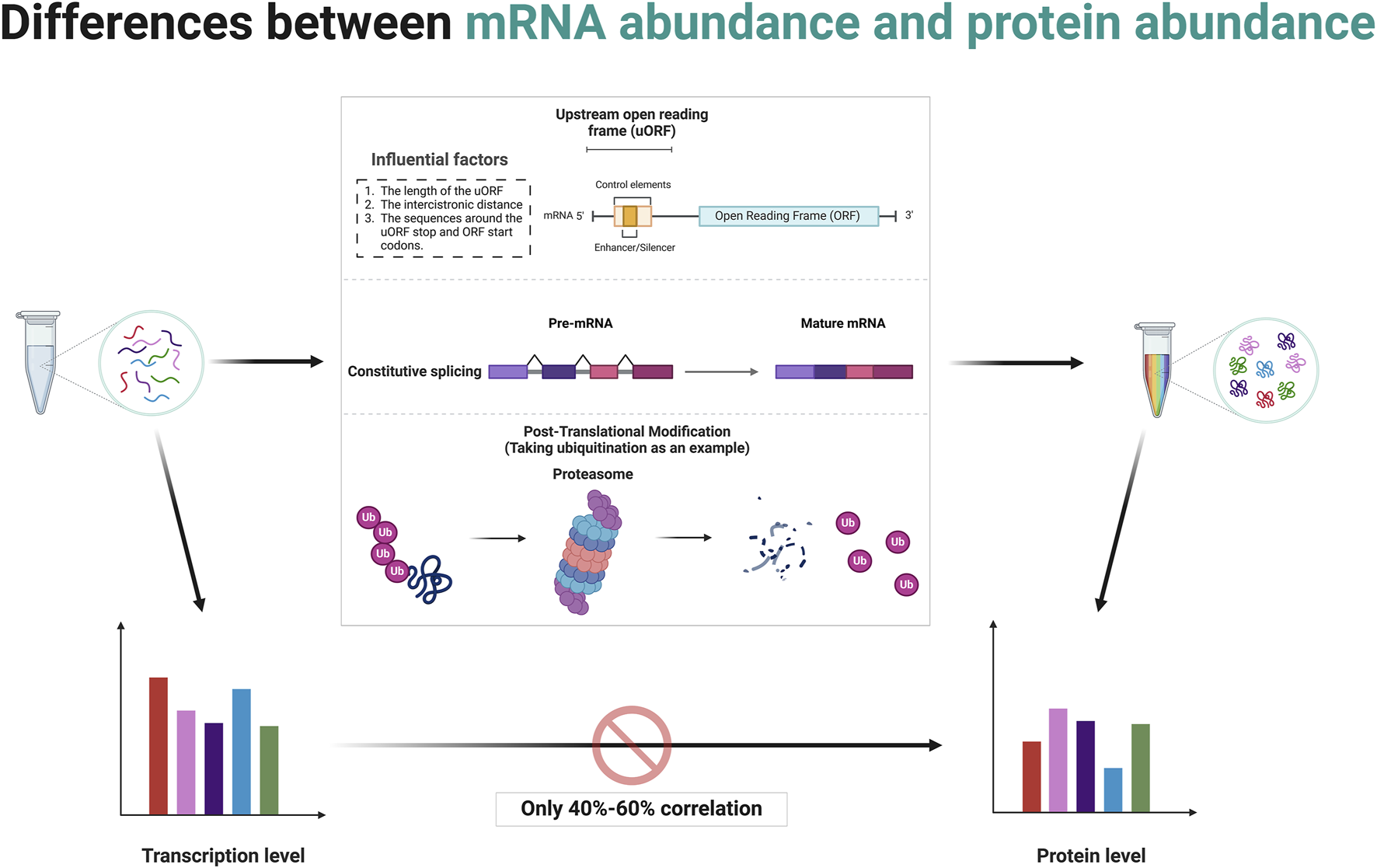 Post-transcriptional and post-translational modifications contribute to discrepancies between mRNA abundance and protein abundance. Created in BioRender. ZHAO, X. (2025) https://BioRender.com/q14t025.