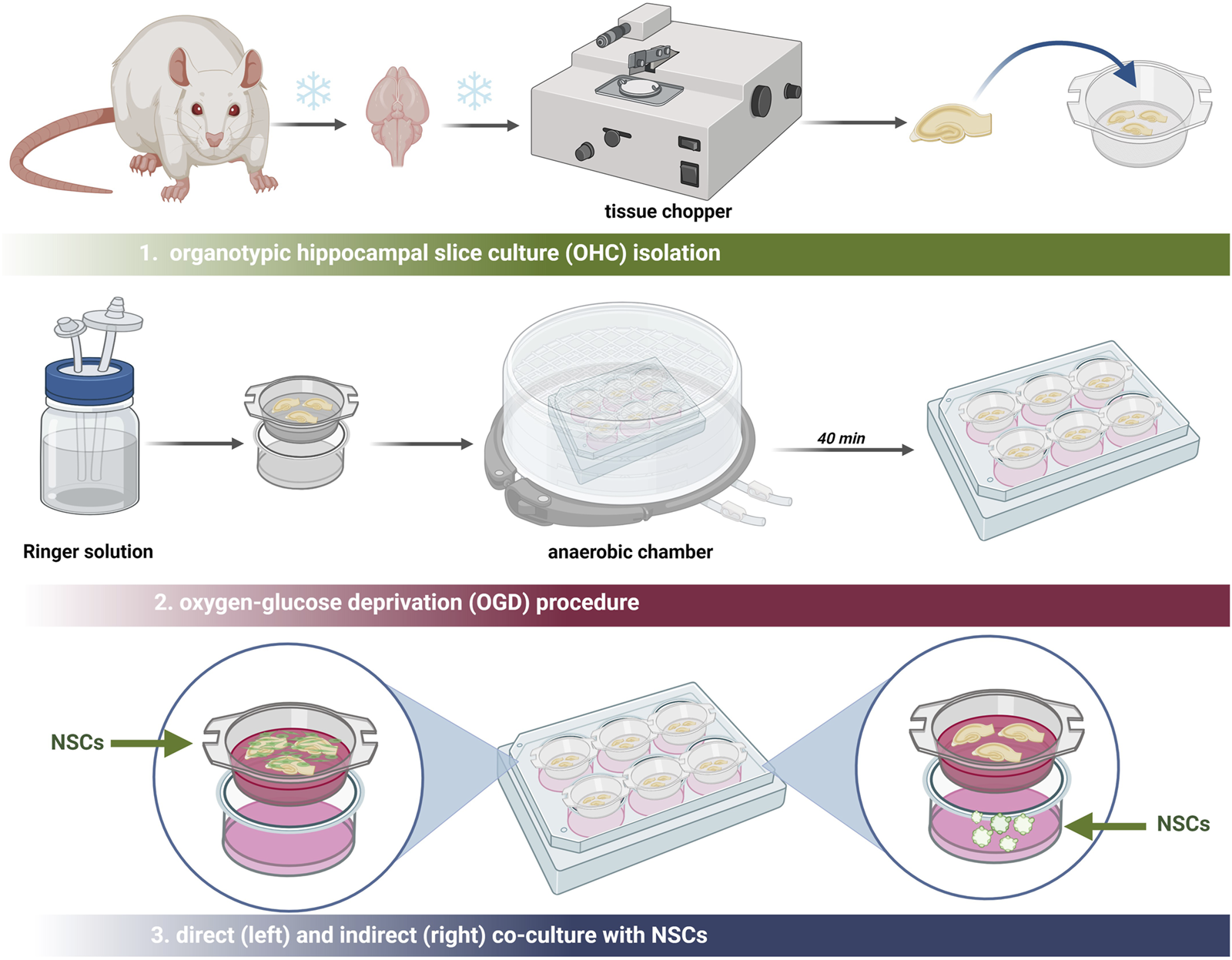 For ex vivo experiments, 7-day-old Wistar rats (12 animals) were obtained from the Mossakowski Medical Research Institute Breeding House. All experiments were approved by the Ethical Committee and conducted in accordance with ethical guidelines. The experiment was conducted following the Stoppini method that was previously modified in our lab (Stoppini et al., 1991; Figiel-Dabrowska et al., 2021). All procedures were performed on ice. In brief, following decapitation, the rat hippocampi were isolated and sectioned into 400 µm slices using a McIlwain tissue chopper (Ted Pella, Poznan, Poland) into 400 µm slices. The selected slices were transferred onto the organotypic culture membranes (Millipore, Concord Road Billerica, MA, USA), placed on 6-well plates (ThermoFischer Scientific) and filled with 960 µL of the medium consisting of DMEM/F12 (Gibco), 25% HBSS (Gibco), HEPES (Gibco), 5 mg/mL glucose (Sigma-Aldrich) and 1% of antibiotic-antimycotic solution (Gibco). The rat organotypic hippocampal slice cultures (OHC) were maintained for 7 days at 34°C, in an atmosphere of 5% O2 and 5% CO2. After the incubation period, the OHCs were utilized for co-culture experiments with various NSC culture conditions.