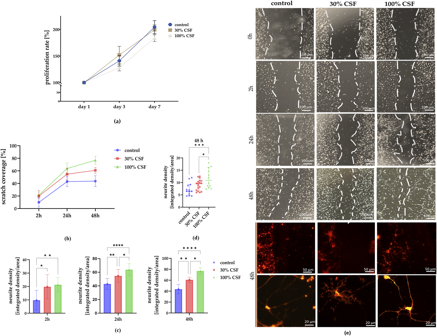 (a) The impact of CSF on hNSC proliferation rate (n = 5) after days 1, 3, and seven of culture. (b) Determination of neurite outgrowth from scratch injury after 0, 2, 24, and 48 h. Scratch coverage for all culture variants after 2, 24, and 48 h from the injury. (c) Changes in scratch coverage between the variants. (d) Neurite density after 48 h in all experimental variants. n = 12-18 (e) Representative images of NSCs cultured in standard medium (control), medium with 30% addition of CSF, and 100% of CSF. After 48h, the cells were stained using a Neurite Outgrowth Kit. The results of all presented experiments are expressed as mean values ±SD. The differences were considered statistically significant when p-value <0.05. Statistical significance level * for 0.01 < p < 0.05; ** for 0.001 < p < 0.01; **** for p < 0.0001; *** for 0.0001 < p < 0.001; **** for p < 0.0001.