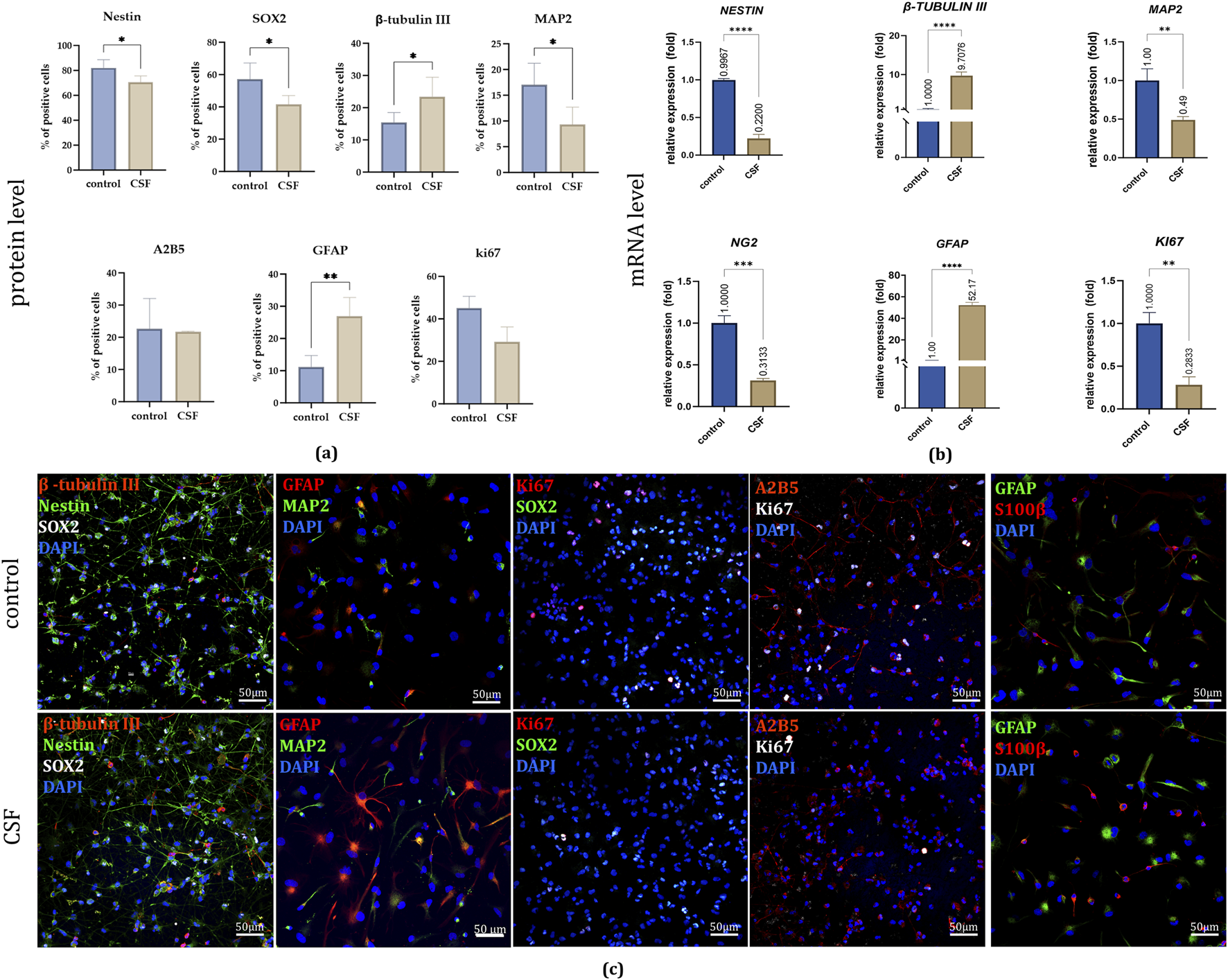 On the protein level, in 2D culture, after 7 days, immunofluorescence staining revealed significant changes in marker expression (Figures 5a, c). The early neural marker NESTIN showed a significant decrease in the CSF group (70.6% ± 5%) compared to the control group (82.1% ± 6.6%). Similarily, we noticed a decrease in SOX2, neural stem and progenitor marker presence for the CSF culture (CSF: 41,5 ± 5.5%, control: 57% ± 10%). Conversely, the early neuronal marker β-TUBULIN III increased markedly in the CSF group (23.4% ± 6.1%) relative to the control (15.4% ± 3.1%). However, the neuronal marker MAP2 was significantly lower in the CSF group (9.3% ± 3.4%) compared to the control (17% ± 4.2%). Furthermore, NSC treatment with CSF resulted in a significant upregulation of GFAP, an astrocytic marker (CSF: 6.9% ± 5.8%; control: 11.2% ± 3.6%). No significant changes were observed in the presence of A2B5+ cells (a marker of NSCs able to differentiate into glia) or KI67+ cells (a marker of proliferation) between the treatment variants. CSF treatment in 2D culture significantly alters the expression of various neural markers, indicating further cell differentiation.