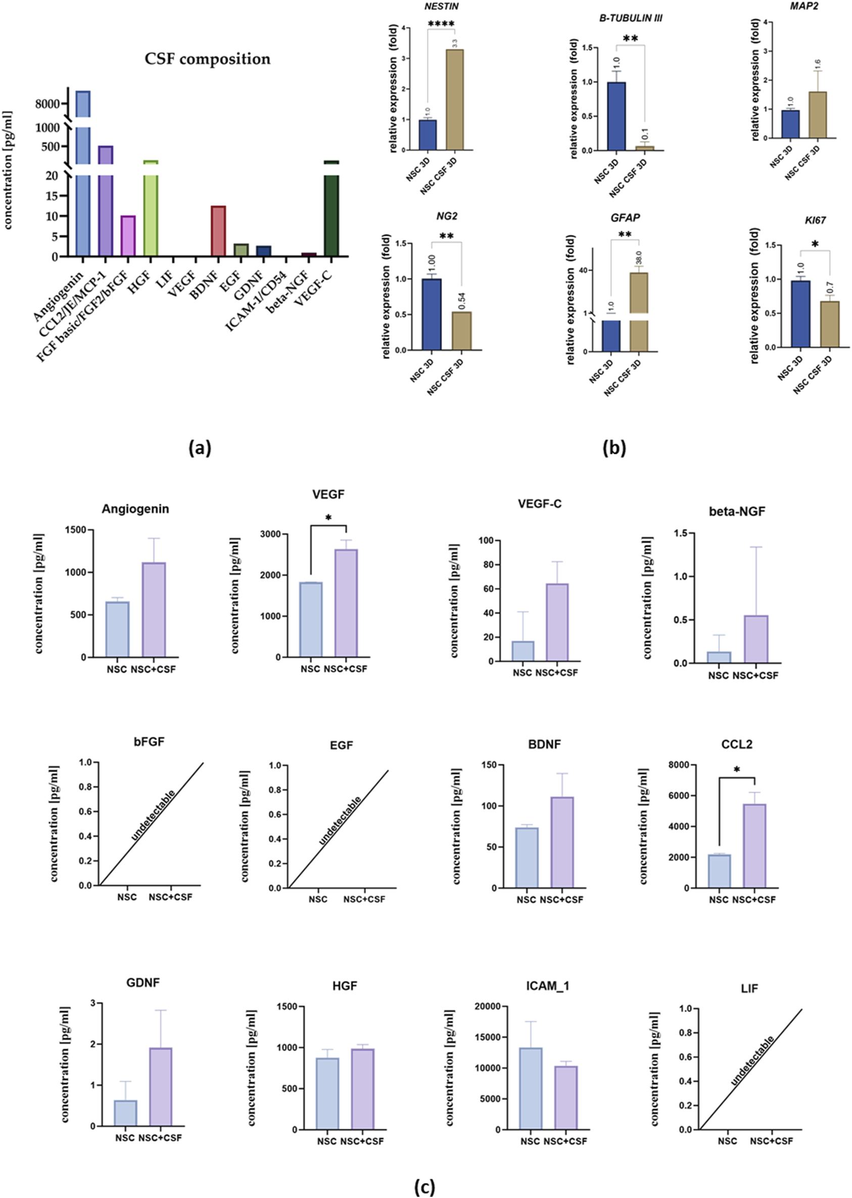 (a) CSF composition. (b) Relative expression of neural and proliferation on day 7 with RPLP0 as a reference gene and NSC cultured in a standard medium as the control group, considered as 1. (c) Cytokines concentration in the medium collected from control cell culture and CSF. The results of all presented experiments are expressed as mean values of three experiments ±SEM. The results are presented as mean values of three experiments ±SD, * for 0.01 < p < 0.05; for p < 0.05; ** for 0.001 < p < 0.01; *** for 0.0001 < p < 0.001; **** for p < 0.0001.