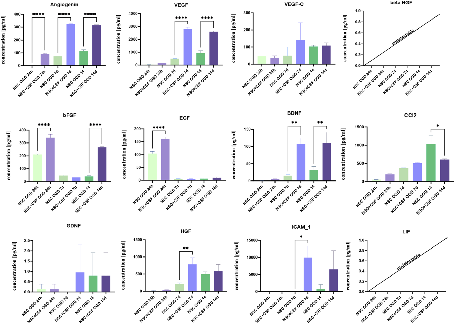 In addition, the media without cells were analyzed. The concentration of Angiogenin, BDNF, CCL2/JE/MCP-1, FGF basic/FGF2/bFGF, EGF, HGF, VEGF, VEGF-C, HGF, ICAM-1, LIF and beta-NGF was investigated using Luminex-based platform and Luminex 200 IS V2.1 Software (Bio-Rad, Hercules, CA, USA). Standard curves were obtained from the reference cytokine gradient concentrations. All the samples were stored at −80 °C before the analysis. All procedures were made on ice. Each sample was frozen/thawed only once.