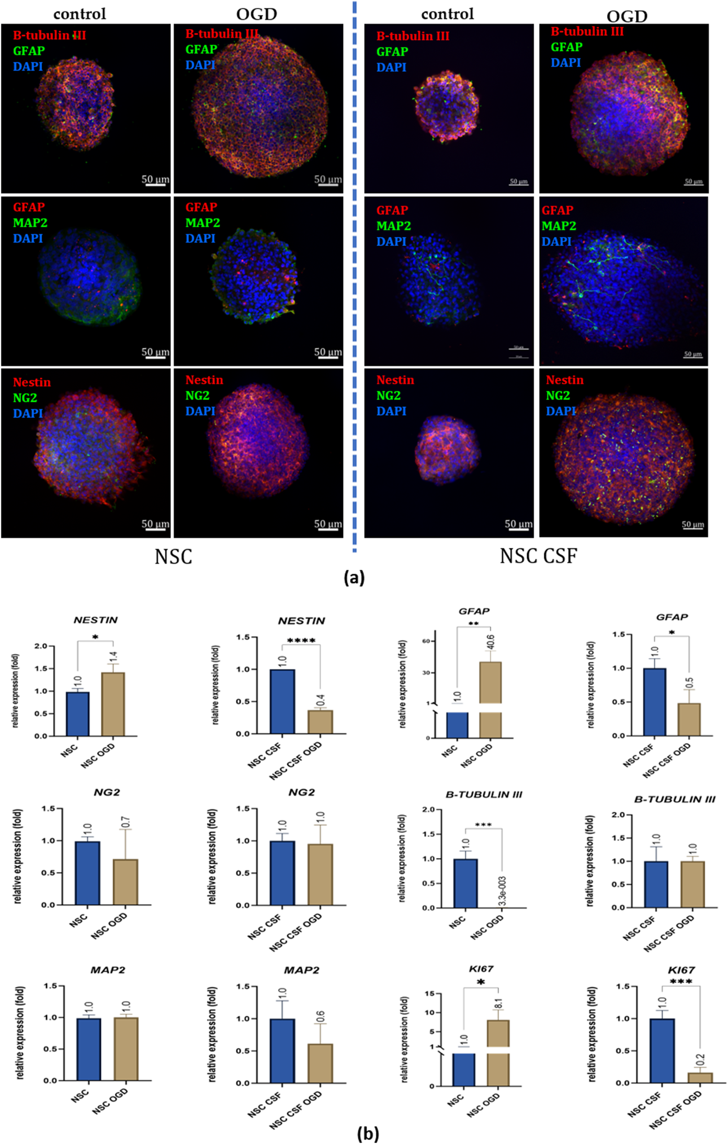 In 3D culture, on the mRNA level, we found significant differences in NESTIN and β-TUBULIN III expression between the control and CSF groups (Figure 6b). Unlike in the 2D culture, NESTIN expression was upregulated in the CSF group (3.3-fold), whereas β-TUBULIN III was downregulated (0.065 ± 0.064 fold) compared to the control. For other markers, the trends were similar to those observed in the 2D culture. Most notably, GFAP expression was significantly higher in the CSF group (38.03 ± 5.49 fold) than in the control. Both NG2 and KI67 were downregulated in the CSF group (0.54 fold and 0.68 ± 0.085 fold, respectively) compared to the control. There were no significant differences in the expression of MAP2 between the two variants. Thus, in 3D culture, CSF treatment induces changes in gene expression among hNSCs, including upregulation of neural and astrocytic markers, and downregulation of early neuronal, oligodendrocytic, and proliferation markers compared to the control conditions.