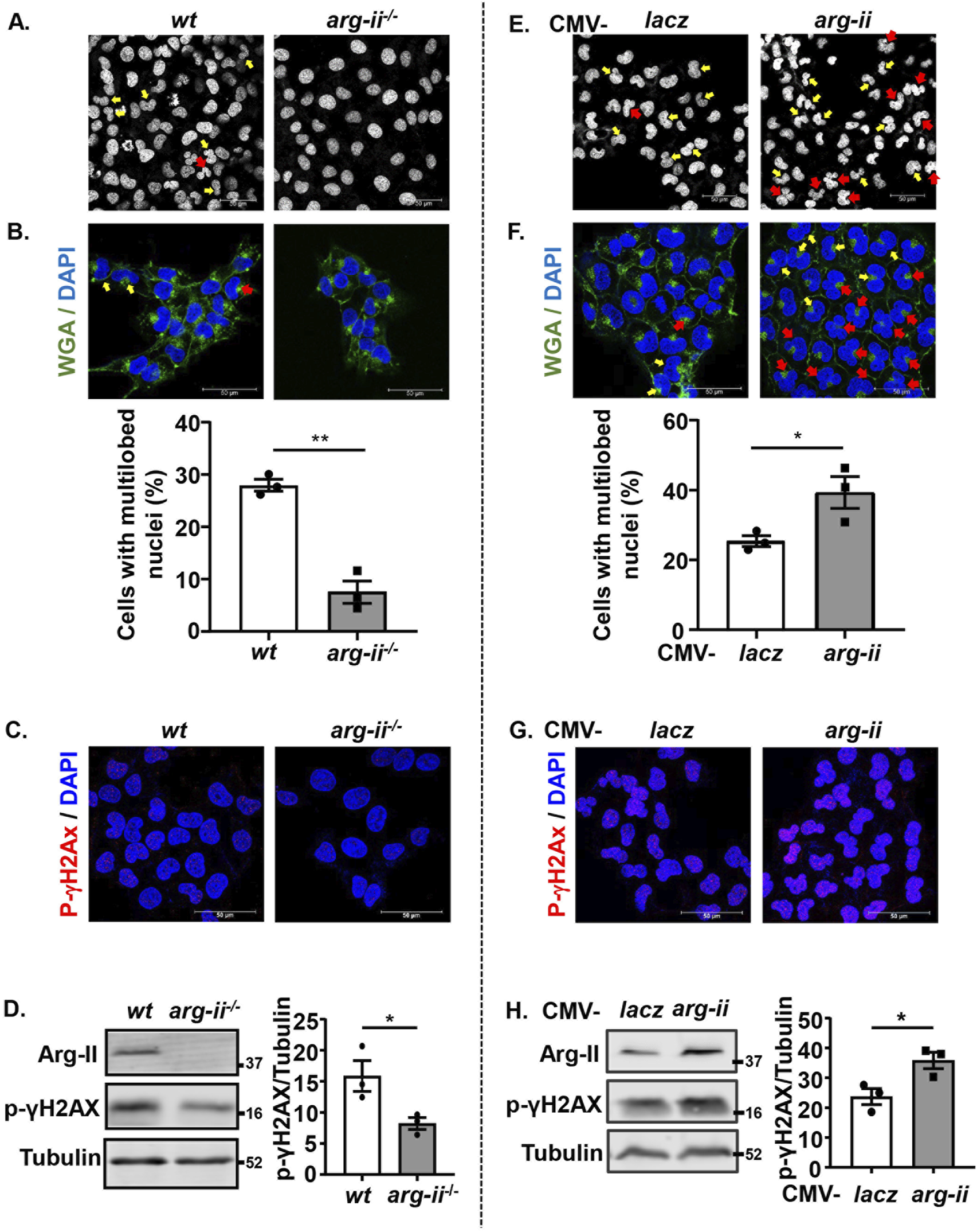 We further investigated the effects of arg-ii-knockout on nuclear morphology and DNA damage on the tumour cells in view that these are indicative of tumour metastasis and malignancy. A decrease in number of cells with multi-lobed nuclei was observed in arg-ii−/− melanoma cells when compared with the wt cells (Figure 2A). To further confirm that Arg-II induces nuclear deformation and to better demonstrate whether the heteromorphic nuclei are in individual cells, cells were stained with DAPI and WGA to visualize nuclei and cell border, respectively (Figure 2B). For evaluation, the percentage of ovoid or kidney-shaped (1-lobed) nuclei and heteromorphic multi-lobed nuclei in the field of view for each image was counted and calculated. Arg-ii−/− cells revealed significantly lower percentage of cells with heteromorphic multi-lobed nuclei (Figures 2A, B). In line with these results, arg-ii-overexpressing cells showed more multi-lobed nuclei (Figures 2E, F). Of note, arg-ii-overexpression caused more severe nuclear deformation as evidenced by more cells with 3- and 4-lobed nuclei (Figure 2F), while wt cells show mostly only 2-lobed nuclei (Figure 2B).