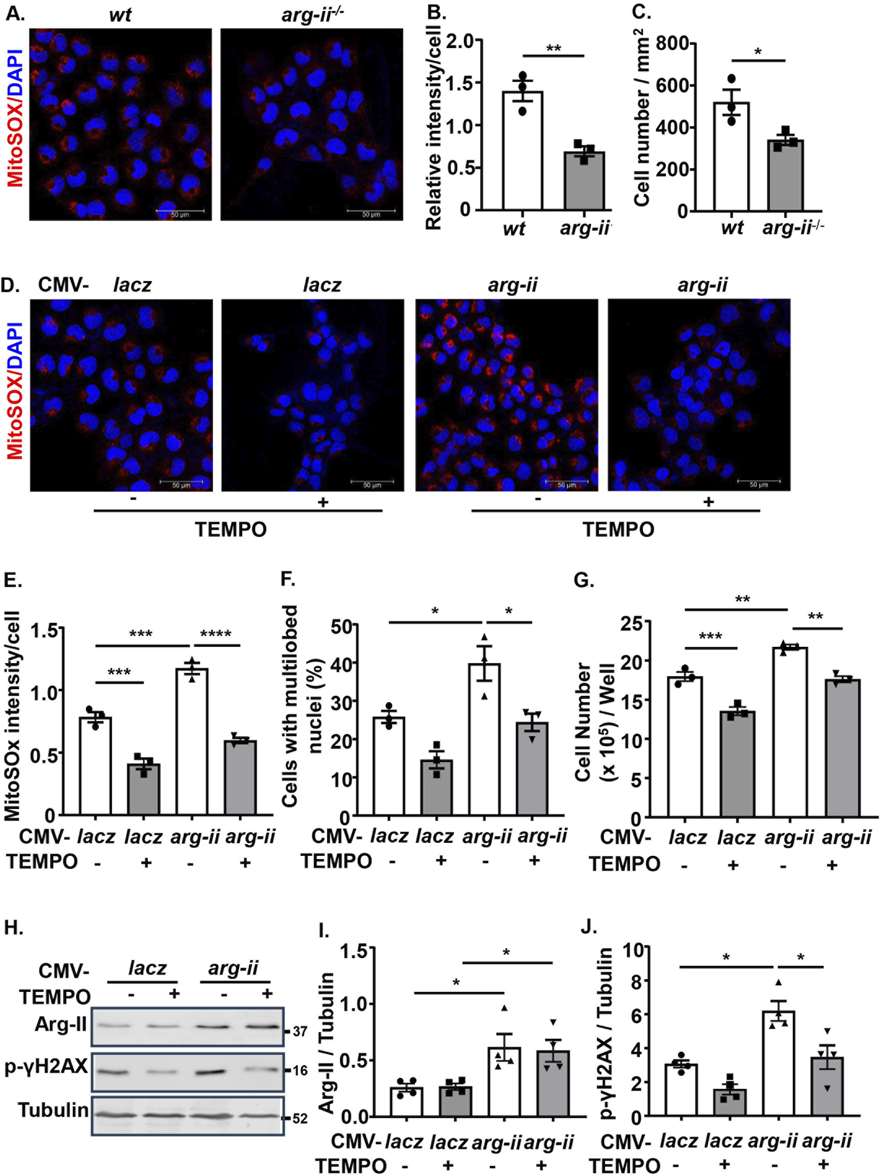 Arg-II promotes melanoma cell growth, nuclear deformation and DNA damage through mtROS. (A) Cultured wt and arg-ii−/− Me276 cells were subjected to MitoSox staining for mtROS (red) followed by counterstaining of nuclei with DAPI (blue). (B) Quantification of MitoSox signals in A. (C) Cell numbers was counted from the immunofluorescence images and presented as cell number/mm2 of image shown in A (n = 3). (D)wt Me276 cells were transduced with rAd-CMV-lacz (Con) or -arg-ii (arg-ii). 48 h post transduction, cells were treated with TEMPO (10 umol/L) for 1 h. After removal of TEMPO, the cells were further cultivated for 24 h and then subjected to MitoSox staining followed by DAPI staining. (E, F) Quantification of MitoSox signals (E) and % of cells with multilobed nuclei (F) from the images shown in (D). (G) Cell number per well counted with the Neubauer cell counting chamber and presented as cell number/well. (H) Experiments were performed as described in Figure 3D except that immunoblotting analysis was performed. (I, J) Quantification of Arg-II (I) and p-γH2AX-S139 (J) from the blots shown in (H). Scale bar: 50 µm. *p < 0.05, **p < 0.01, ***p < 0.001, ****p < 0.0001 between the indicated groups.