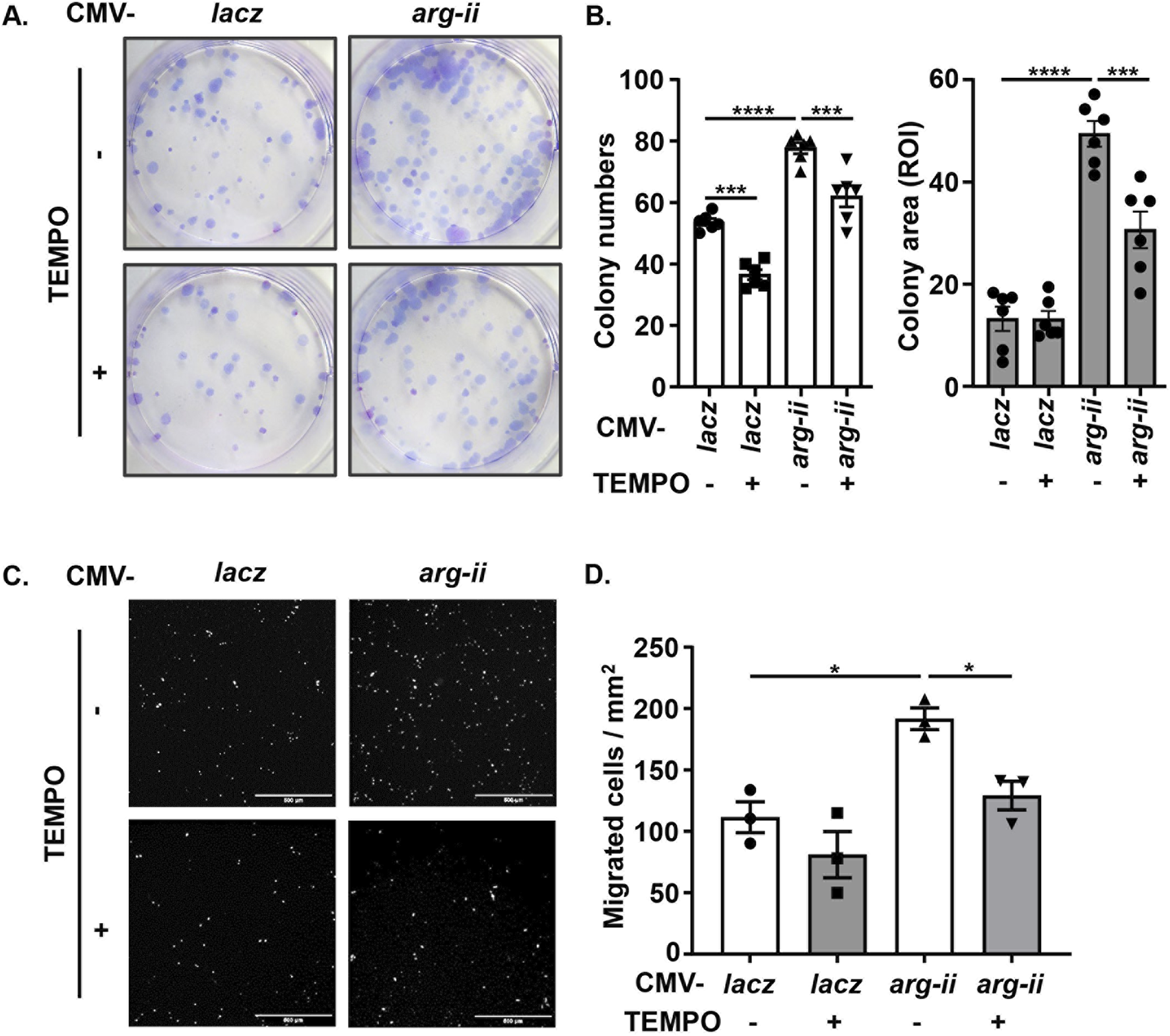 Arg-II promotes tumor colony formation and migration via mtROS. Experiments were performed as described in Figure 3D except that (A, B) colony formation assay (ROI: region of interest) and (C, D) trans-well migration assay were performed 12 days or 48 h, respectively, post transduction, Scale bar: 500 µm. *p < 0.05, ***p < 0.001, ****p < 0.0001 between the indicated groups.